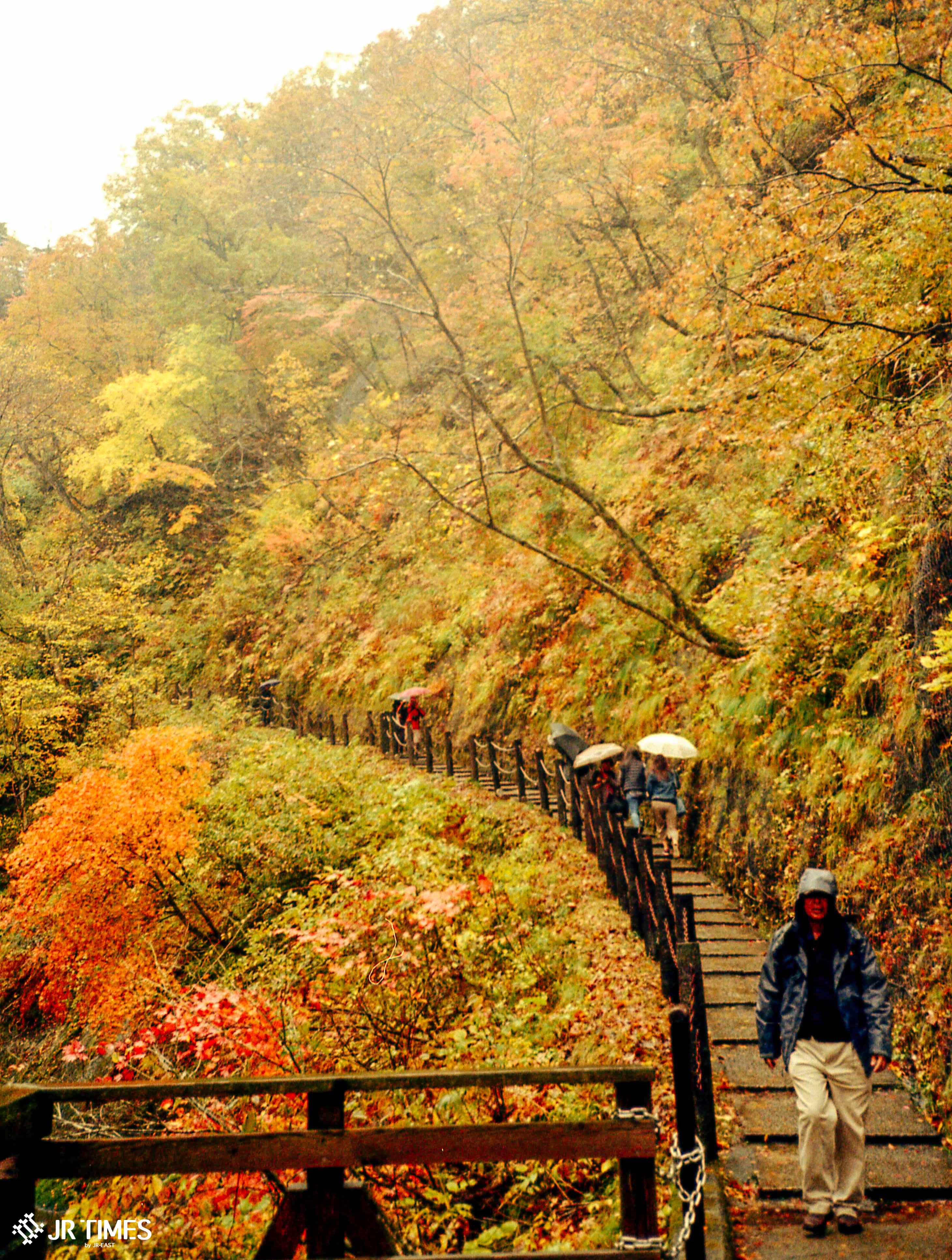 It turns out that these were avid trainspotters who were eagerly waiting for the Riku-East Line train to peek out through the tunnel that cuts through the valley of Naruko Gorge. This photo opportunity comes about 15 times a day when the train traverses between Naruko Onsen Station and Nakayamadaira-Onsen Station, and there’s even a schedule that’s put up around the area to let you know about this in advance.