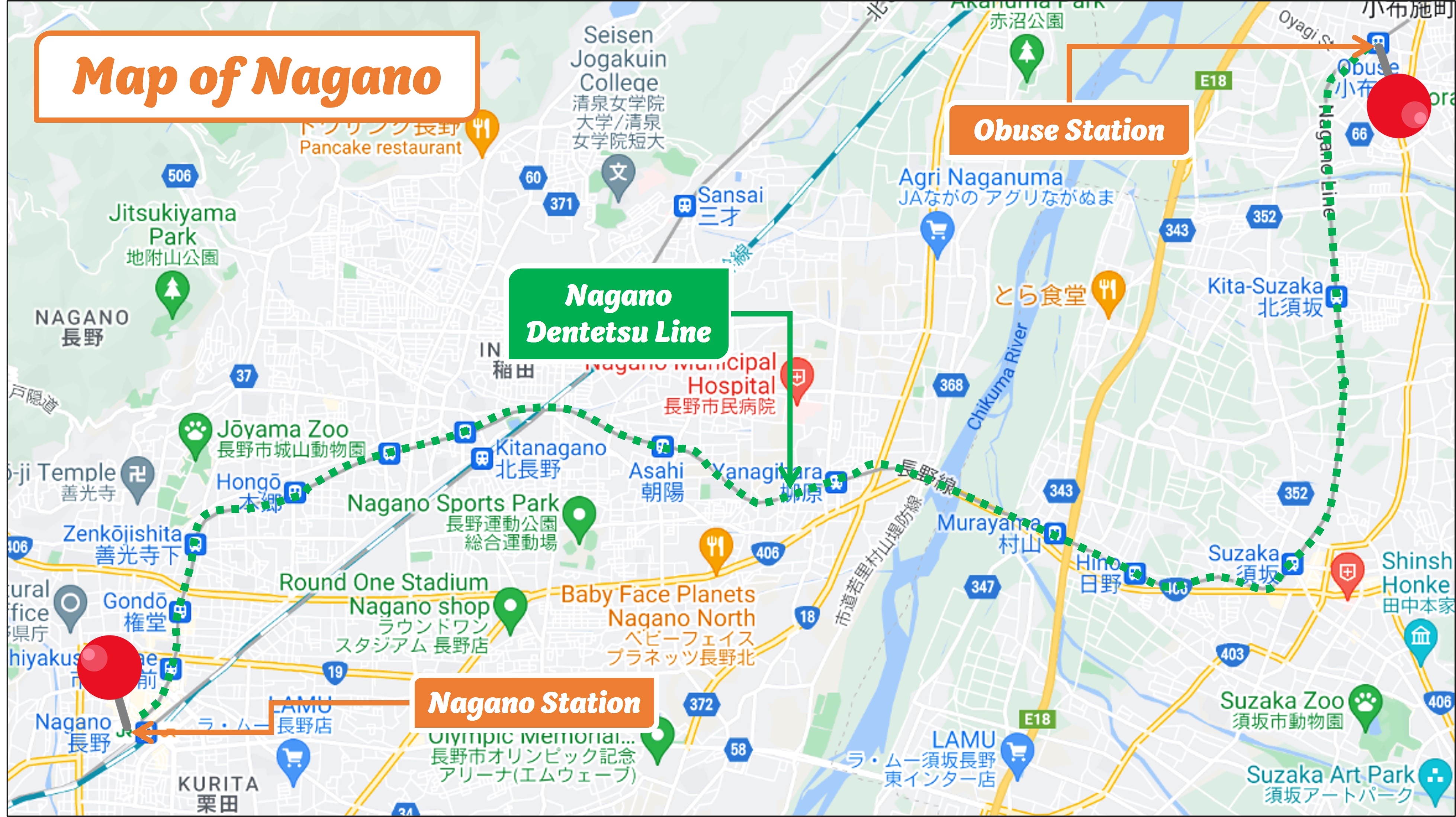 Here’s another interesting point to share about the Nagano Dentetsu Line. Apart from Obuse Station, it also features Yudanaka Station (湯田中駅), which is the gateway to Shiga Kogen (志賀高原 Shiga Kōgen), the largest combined ski area in Japan and also one of the venues for the 1998 Winter Olympic Games, and Jigokudani Snow Monkey Park (地獄谷野猿公苑), where visitors can see adorable macaque monkeys bathing in hot spring water in the open. If you plan to head straight for Yudanaka from Nagano, you can consider taking the Nagaden Express, a limited express train bound for the station.