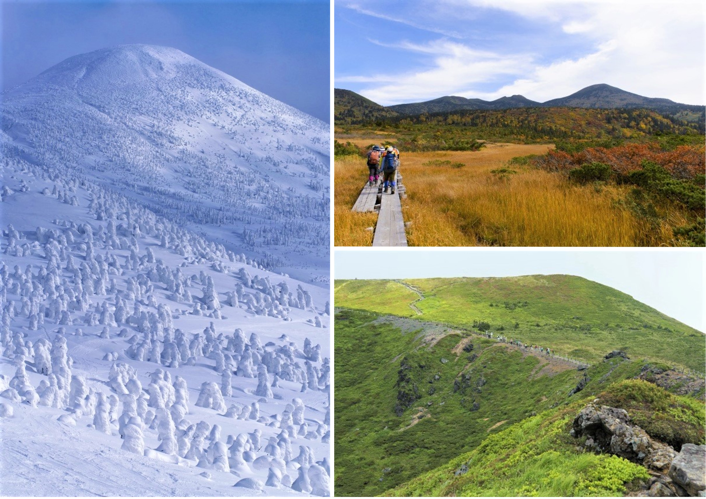 Snow monsters during winter (left) and hiking in autumn (top right) and summer (bottom right). (Image credit: Aomori Prefecture)