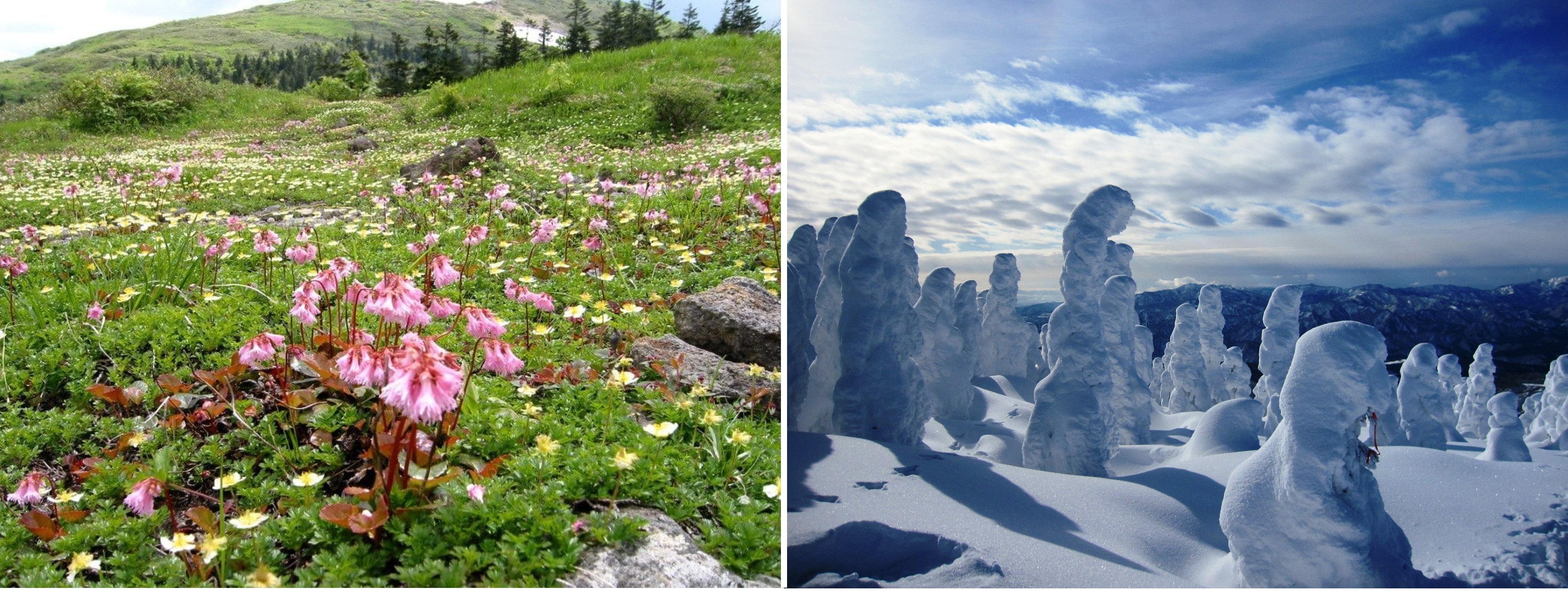 Alpine flowers in the summer (left) and snow monsters during winter (right). (Image credit: Akita Inu Tourism)