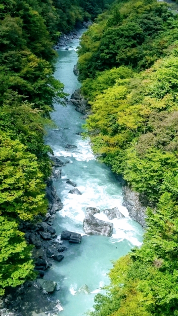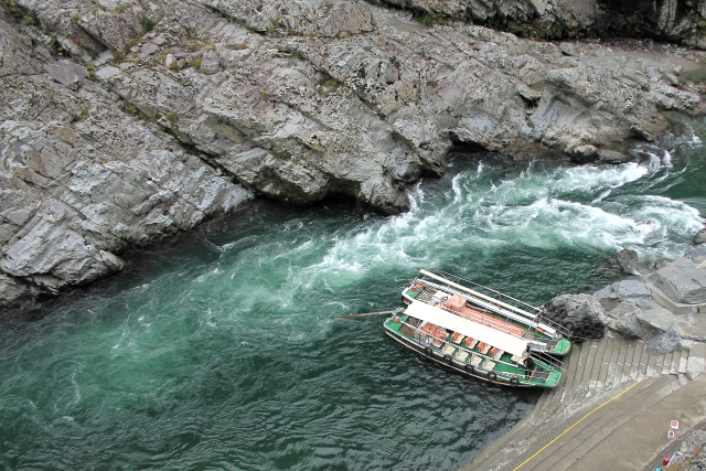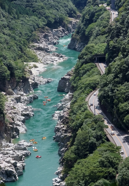 Often referred to collectively as the Ōboke-Koboke-kyo (大歩危小歩危峡 Ōboke and Koboke Gorges) by the locals, these two gorges make up a span of eight kilometres of the Yoshino River (吉野川 Yoshino-gawa) in Tokushima Prefecture. The Yoshino River is one of Japan’s three greatest rivers along with the Tone (利根川 Tone-gawa) and the Chikugo rivers (筑後川 Chikugo-gawa), and is the longest on the island of Shikoku. The walls of the Ōboke-Koboke Gorges are lined by steep jagged cliffs forged 80–60 million years ago on the bottom of the ocean. The emerald waters of the otherwise calm and meandering Yoshino River flow between these rocky banks, giving way to lush green mountains above. The waters become awe-inspiring choppy rapids as they enter the gorges, earning them a reputation as the best white water rapids in all of Japan.