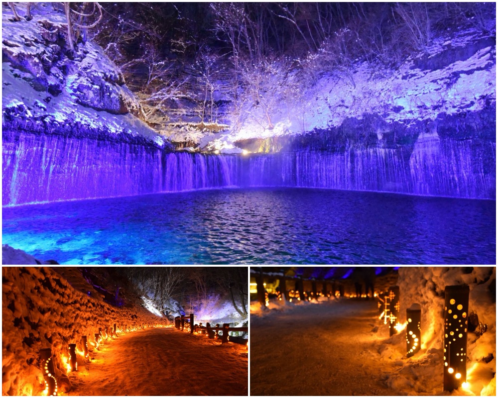 Illuminations at Shiraito Falls the path leading to it. (Image credit: 軽井沢観光協会)