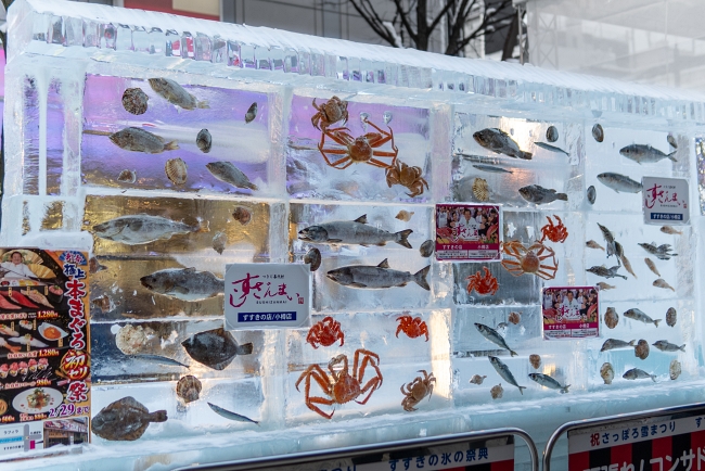 Perhaps the most head-turning (and perhaps even controversial for some) display at the Susukino Site, though, would be the “fish ice” (魚氷 sakana-gōri), an ice aquarium of various types of fish frozen in blocks of ice. The spectacular display, first started in 1984, was meant as a homage to the many varieties of seafood that could be caught in Hokkaido, including salmon, atka mackerel, crabs, and others. In years with warmer winters, though, it does get cleared away before the end of the festival period if it starts to melt, so whether you get to catch it or not (bad pun intended) depends on when you visit!