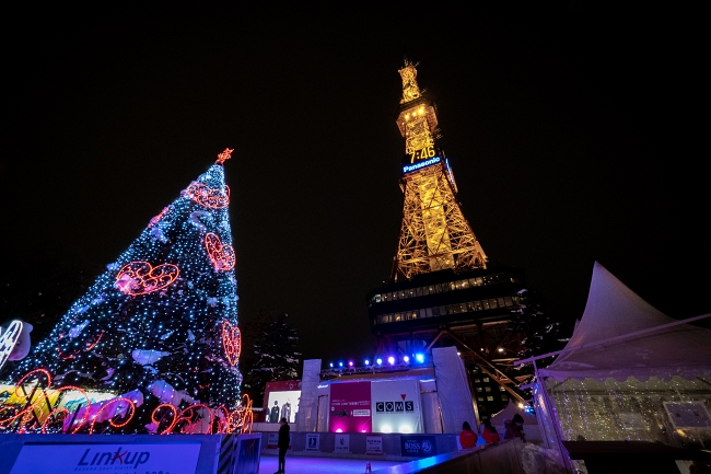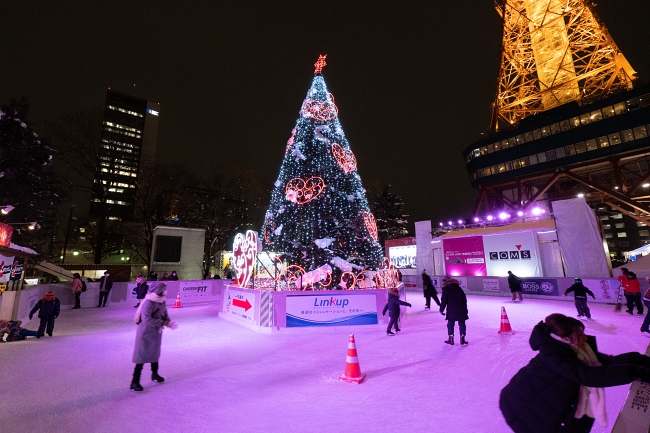 The outdoor skating rink at the Ōdori site lit up in pink. (Image credit: Bryan Tay)