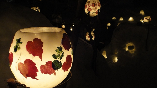 The entrance to one of the venues for the Otaru Yuki-akari no Michi, with ice blocks carved into shapes and decorated with dried flowers and leaves. Note the date on the ice panel—it is changed everyday! (Image credit: Kevin Koh)