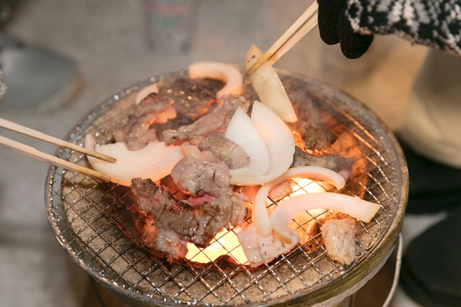 Meat and onions being grilled on the provided charcoal stoves. It’s a test of one’s patience… (Image credit: 北見市観光振興室 観光振興課)