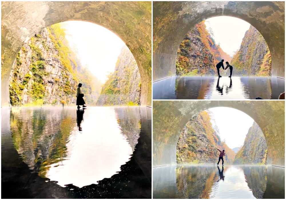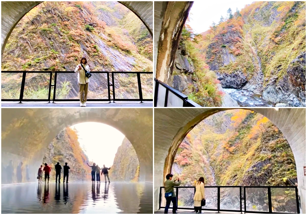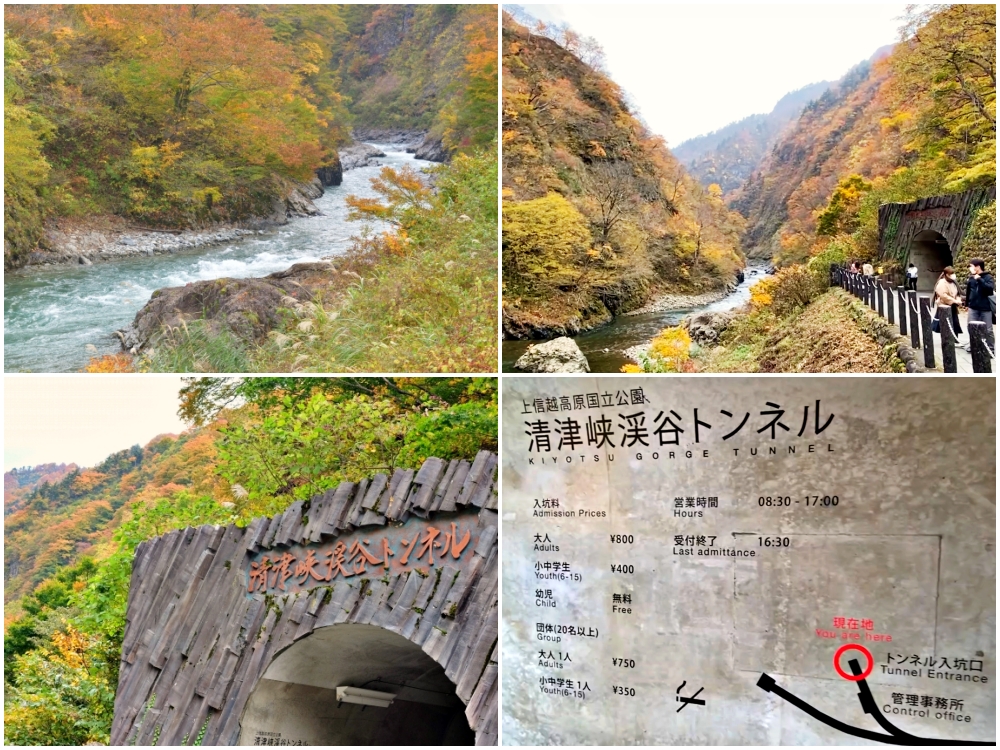 เมื่อลงไปตามแม่น้ำคิยตสึเราจะเจอกับอีกจุดชมใบไม้แดงที่ไม่เหมือนใคร นั่นคือ Kiyotsu Gorge Tunnel (清津峡渓谷トンネル Kiyotsukyо̄ keikoku tonneru) ช่องเขาคิยตสึเป็นหนึ่งในสามช่องเขาที่ยิ่งใหญ่ที่สุดในญี่ปุ่น (日本三大峡谷 Nihon Sandai Kyо̄koku) โดยอีกสองช่องเขานั้นได้แก่ช่องเขาคุโรเบะ (Kurobe Gorge) ในจังหวัดโทยามะและหุบเขาโอสุกิดานิ (Osugidani Valley) ในจังหวัดมิเอะ