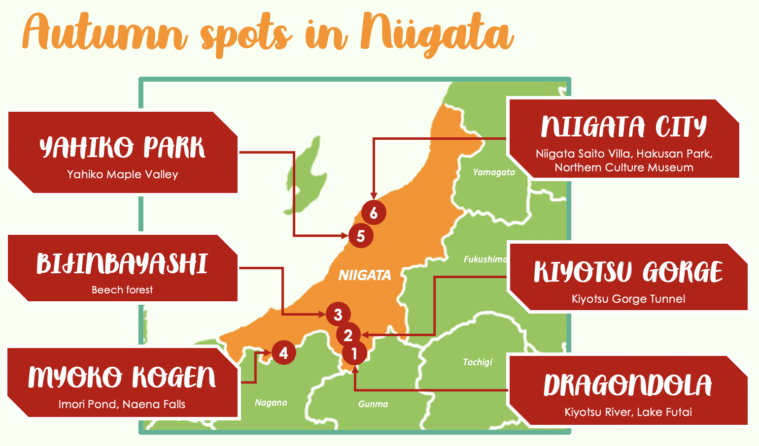 ในบทความนี้ ฉันจะแนะนำสถานที่ห้ามพลาดสำหรับการชมสีสันสวยงามแห่งฤดูใบไม้ร่วงของจังหวัดนีงาตะ ไม่ต้องห่วง สถานที่ทั้งหมดนี้สามารถไปถึงได้ง่ายโดยนั่งรถบัสหรือเดินเท้าจากสถานีที่ใกล้ที่สุด คุณพร้อมหรือยัง? ไปกันเลย!
