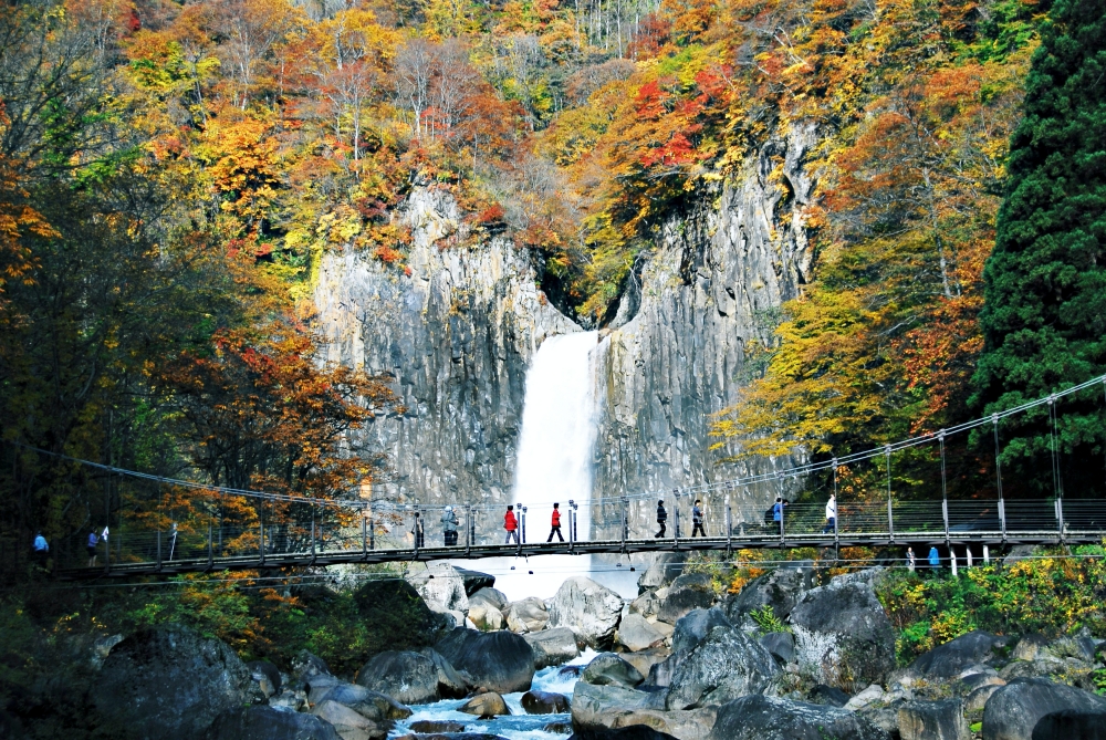 น้ำตกนาเอนะในฤดูใบไม้ร่วง (เครดิตภาพ: 新潟県観光協会)