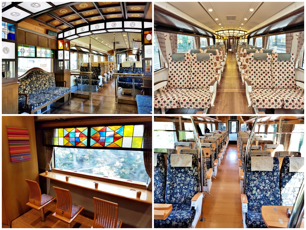 รถไฟ A-TRAIN มีการตกแต่งภายในด้วยไม้อย่างทันสมัย การเน้นด้วยกระจกสีที่ได้รับแรงบันดาลใจจากโบสถ์จำนวนมากในอะมะคุสะ ผ้าคลุมที่นั่งถูกตกแต่งอย่างสวยงามด้วยลายคลาสสิคและมีที่นั่งหลากแบบตั้งแต่ที่นั่งธรรมดา ที่นั่งเป็นกลุ่มที่มีโต๊ะพับได้อยู่ตรงกลาง ไปจนถึงที่นั่งโซฟากว้างและที่นั่งหันหน้าออกหน้าต่าง