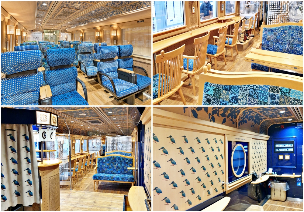 การตกแต่งภายในที่เก๋ทันสมัยของแต่ละตู้ก็มีธีม ด้วยสีน้ำเงินหลากเฉดได้ประดับประดาตู้ KAWASEMI รวมไปถึงมีที่นั่งพร้อมโต๊ะ และมีที่นั่งหันหน้าเข้าหน้าต่าง สิ่งหนึ่งที่เป็นเอกลักษณ์ของตู้ KAWASEMI ก็คือมีแม้กระทั่งมุมชมนก พร้อมครบครันไปด้วยหน้าต่างกลมขนาดใหญ่และกล้องส่องทางไกล
