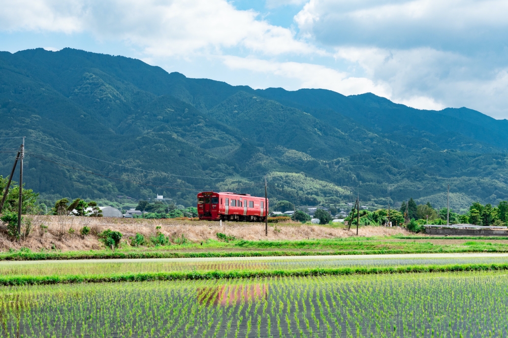 ได้วิวทิวทัศน์ที่ยิ่งใหญ่ของเทือกเขามิโนะจากเส้นทางรถไฟสาย Kyudai Main Line (เครดิตภาพ:久留米観光コンベンション国際交流協会)