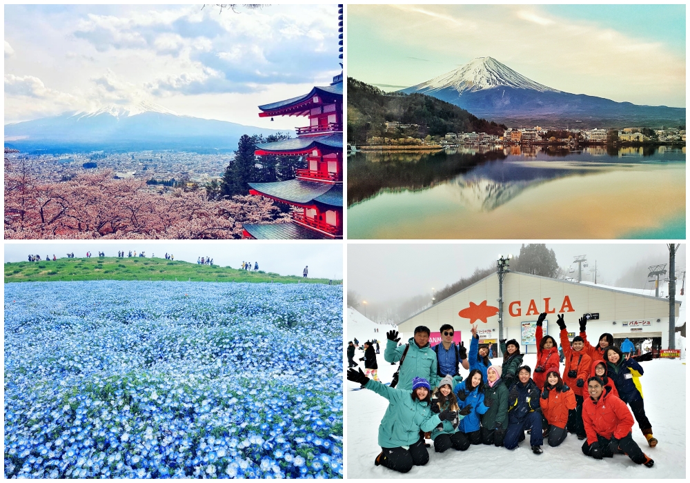 ตามเข็มนาฬิกาจากซ้ายบน: สวนอะระคุระเซ็นเง็น, ทะเลสาบคาวากุจิ, GALA Yuzawa และ สวน Hitachi Seaside Park ซึ่งเป็นสถานที่ท่องเที่ยวที่คุณสามารถเดินทางไปถึงได้ด้วย JR TOKYO Wide Pass (เครดิตรูปภาพ: JR East / Carissa Loh)