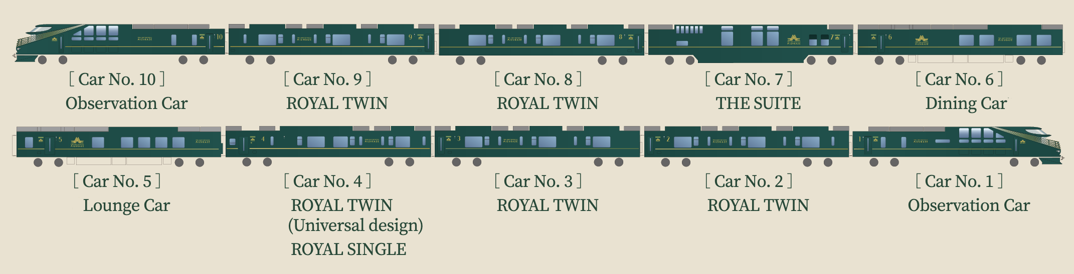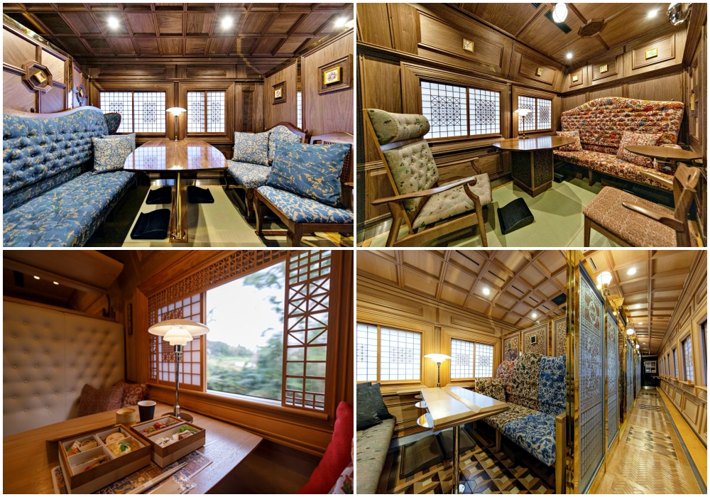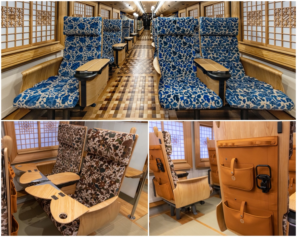 ห้องโดยสารทั้ง 4 ห้องในตู้รถไฟคันที่ 1 เป็นพื้นเสื่อทาทามิ และจุผู้โดยสารได้ห้องละ 3-4 คน ส่วนคันที่ 2 เป็นพื้นไม้ 3 ห้องโดยมีที่นั่งห้องละ 3-6 ที่ และคันที่ 3 มี 6 ห้อง มีที่นั่งห้องละ 1-2 ที่