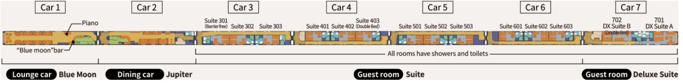 เลานจ์ Blue Moon (ラウンジカー「ブルームーン」) ในตู้รถไฟคันที่ 1 มีเก้าอี้แบบหมุนได้และโซฟาสวยหรู เป็นห้องที่ผู้โดยสารสามารถผ่อนคลายและเพลิดเพลินกับการแสดงดนตรีสดได้ เกาะคิวชูเป็นขุมทรัพย์ของอาหารอร่อย และที่ห้องอาหาร Jupiter (ダイニングカー「木星」) ในตู้รถไฟคันที่ 2 นี้ ผู้โดยสารจะได้ลิ้มลองอาหารรสเลิศที่ใช้วัตถุดิบตามฤดูกาลของคิวชู