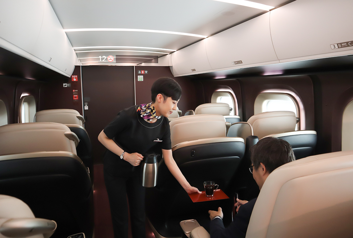 พนักงาน Gran Class จะคอยให้บริการต้อนรับผู้โดยสาร Gran Class ทั้ง 18 ท่านอย่างอบอุ่น และพร้อมที่จะให้ความช่วยเหลืออยู่เสมอเพื่อการโดยสารรถไฟที่สะดวกสบาย เมื่อรถไฟออกจากสถานี พนักงานจะนำผ้าเช็ดมือและเมนูอาหารมาให้ผู้โดยสาร