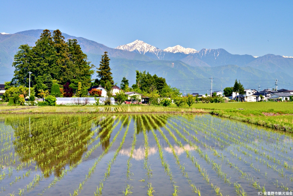 นาข้าวที่มีฉากหลังเป็นภูเขาที่บนยอดปกคลุมไปด้วยหิมะ (เครดิตรูปภาพ: 安曇野市観光協会)