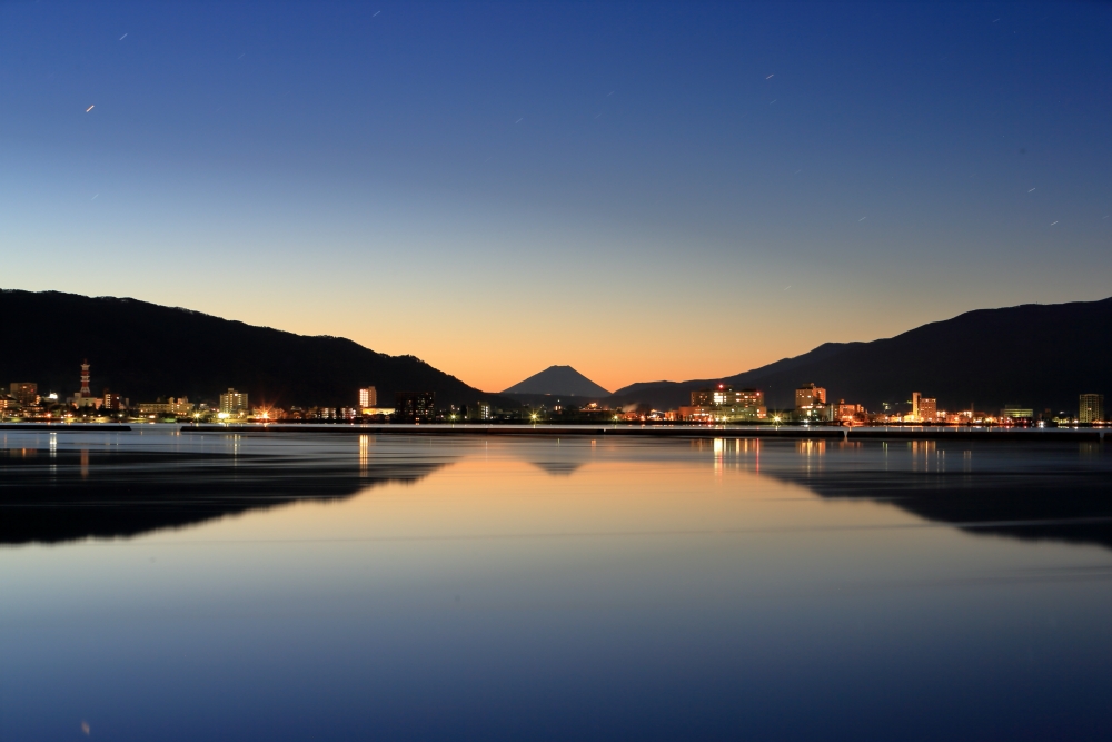 ชมภูเขาไฟฟูจิจากชายฝั่งทางเหนือของทะเลสาบสุวะ (เครดิตรูปภาพ:下諏訪観光協会)