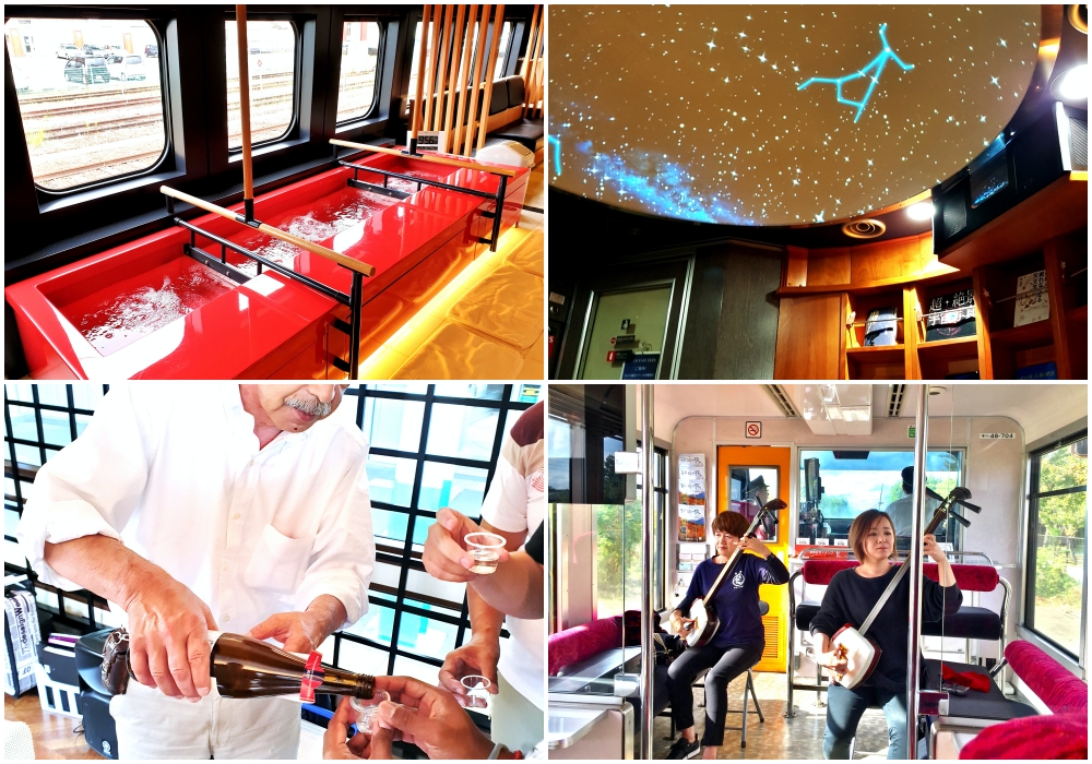 รถไฟท่องเที่ยวบางขบวนมีออนเซ็นเท้า ท้องฟ้าจำลอง การแสดงดนตรี รวมถึงกิจกรรมชิมสาเกบนขบวนรถด้วย (เครดิตรูปภาพ: JR East / Carissa Loh & Akio Kobori)