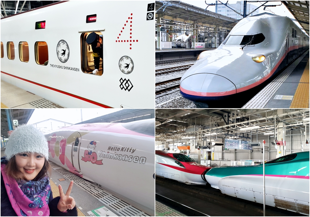 ตามเข็มนาฬิกาจากรูปบนซ้าย: Kyushu Shinkansen, Joetsu Shinkansen, Akita และ Tohoku Shinkansen, Hello Kitty Shinkansen (เครดิตรูปภาพ: JR East / Carissa Loh)