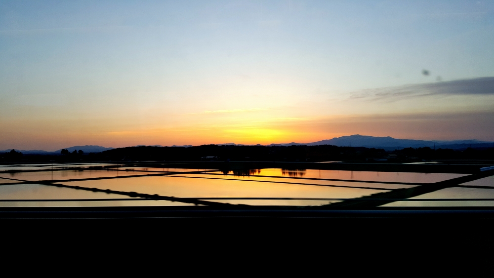 วิวพระอาทิตย์ตกดินเหนือนาข้าวที่เห็นได้จากหน้าต่างรถไฟ (เครดิตรูปภาพ: JR East / Carissa Loh)