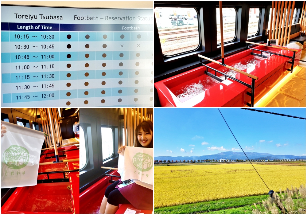 ในฐานะที่ฉันเป็นแฟนคลับออนเซ็นตัวยง ฉันจึงทึ่งมากตอนที่ได้นั่งรถไฟ Toreiyu Tsubasa รถไฟชินกันเซ็นที่มีอาชิยุบนขบวนรถ ไฮไลท์ของรถไฟขบวนนี้คือตู้รถอาชิยุที่มีอ่างสีแดงสดและการตกแต่งด้วยไม้ คุณสามารถแช่อาชิยุได้ในราคาเพียง 450 เยนเป็นเวลา 15 นาที และคุณยังจะได้ผ้าขนหนูผืนเล็กและถุงเป็นของที่ระลึก ซึ่งคล้ายกับของที่คุณจะได้ใช้เวลาไปรีสอร์ทออนเซ็นเลย! ที่นั่งของอาชิยุจะหันหน้าไปทางหน้าต่างทำให้คุณมองเห็นวิวชนบทของจังหวัดยามากาตะ ไม่ว่าจะเป็นวิวชนบทที่มีสีเขียวชอุ่มในฤดูร้อน สีทองในฤดูใบไม้ร่วง ไปจนถึงวิวทุ่งนาสีขาวโพลนในฤดูหนาว