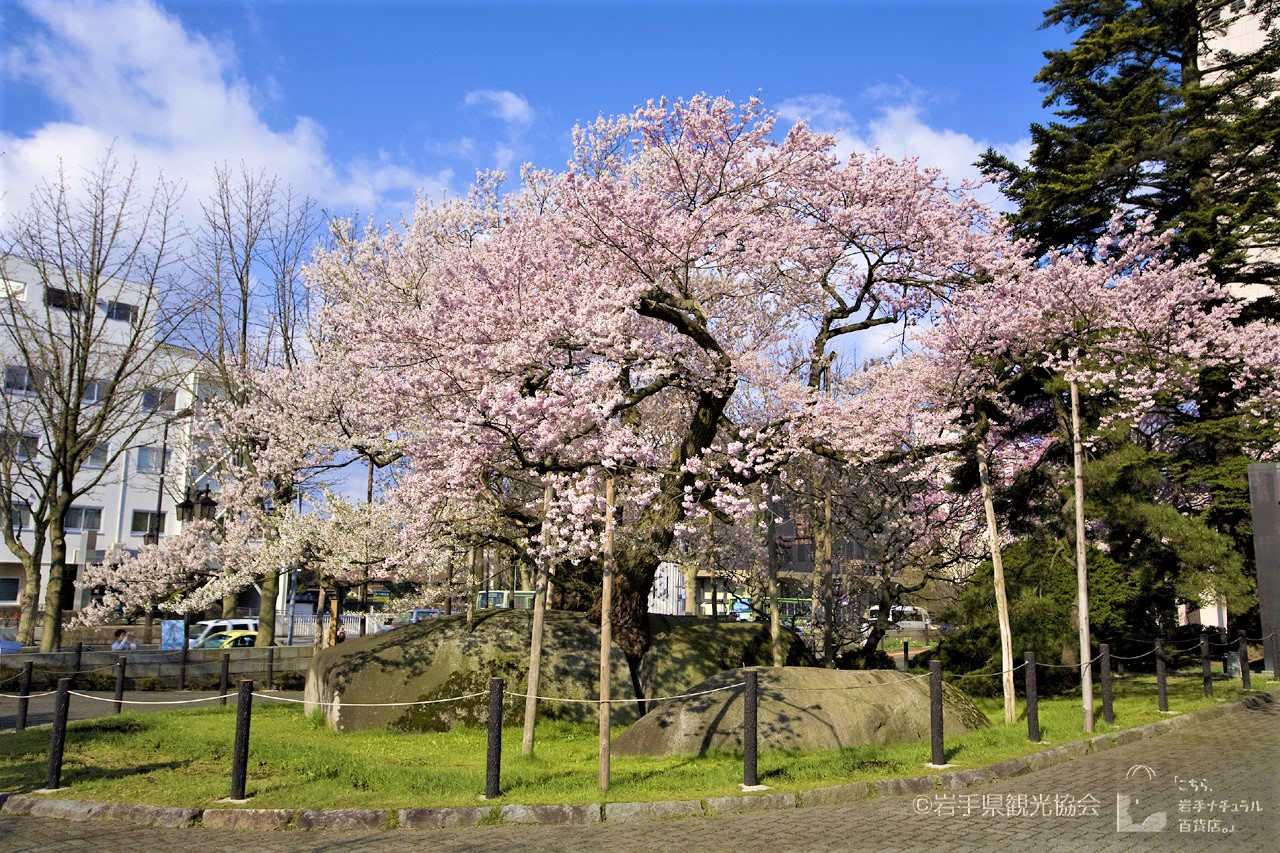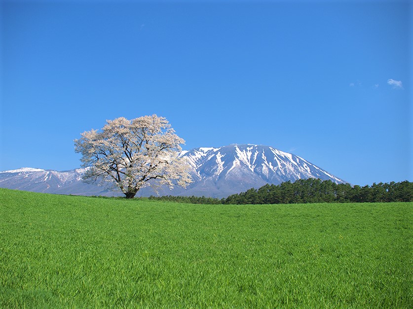 เราเริ่มด้วยหนึ่งในซากุระต้นเดี่ยวที่โดดเด่นเป็นสัญลักษณ์ที่สุดต้นหนึ่งของโทโฮคุ (東北) อยู่ที่จังหวัดอิวาเทะ (岩手県 Iwate-ken) เป็นต้นซากุระโดดเดี่ยวที่อยู่เบื้องหน้าของภูเขาอิวาเทะ (岩手山 Iwate-san) สิ่งที่ทำให้ต้นซากุระนี้โดดเด่นก็คือทิวทัศน์อันงดงามตระการตาราวกับภาพวาด ซึ่งมีการวางเคียงกันของกลีบซากุระสีขาวอมชมพู หญ้าสีเขียวมรกต ท้องฟ้าสีฟ้าและพื้นหลังเป็นภูเขาที่ปกคลุมด้วยหิมะ ทั้งหมดรวมกันเป็นวิวทิวทัศน์ที่ดูเหมือนตรงออกมาจากภาพวาด