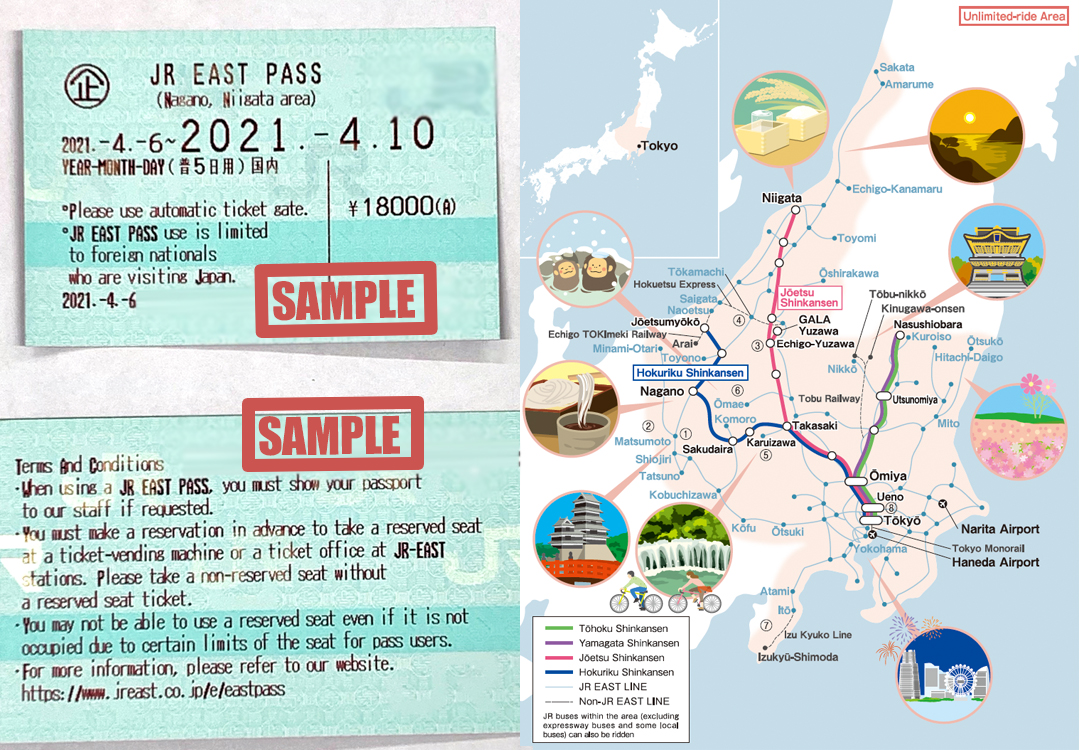 หมายเหตุ: ตั้งแต่ 1 เมษายน 2021 เป็นต้นไปมีการเปลี่ยนแปลงบางอย่างเกี่ยวกับเขตที่ใช้ได้และราคาของตั๋วพาส JR EAST PASS (Nagano, Niigata area) สำหรับข้อมูลเพิ่มเติมกรุณาตรวจสอบที่นี่