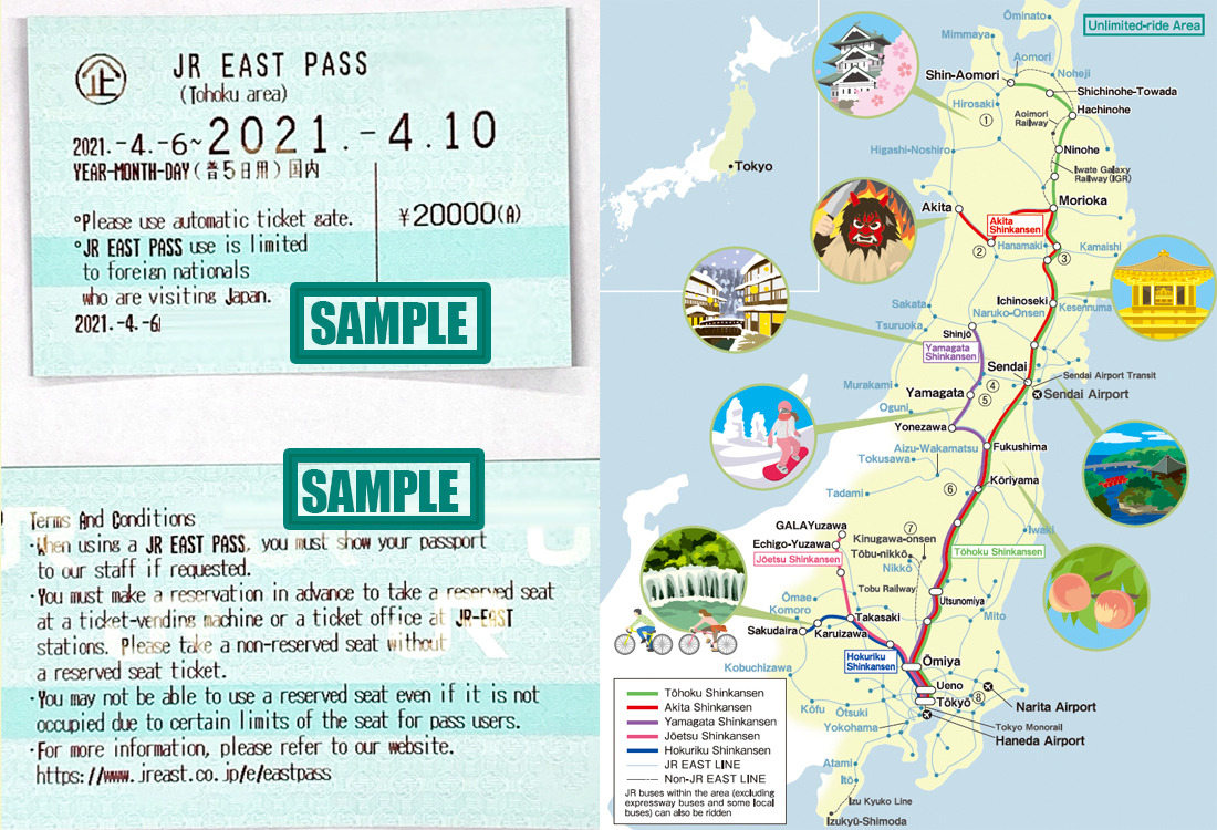 หมายเหตุ: ตั้งแต่ 1 เมษายน 2021 เป็นต้นไปมีการเปลี่ยนแปลงบางอย่างเกี่ยวกับเขตที่ใช้ได้และราคาของตั๋วพาส JR EAST PASS (Tohoku area) สำหรับข้อมูลเพิ่มเติมกรุณาตรวจสอบที่นี่