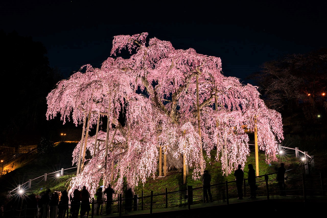 มิฮารุทาคิซากุระถูกประดับไฟในยามค่ำคืน (เครดิตภาพ: Fukushima Prefecture)