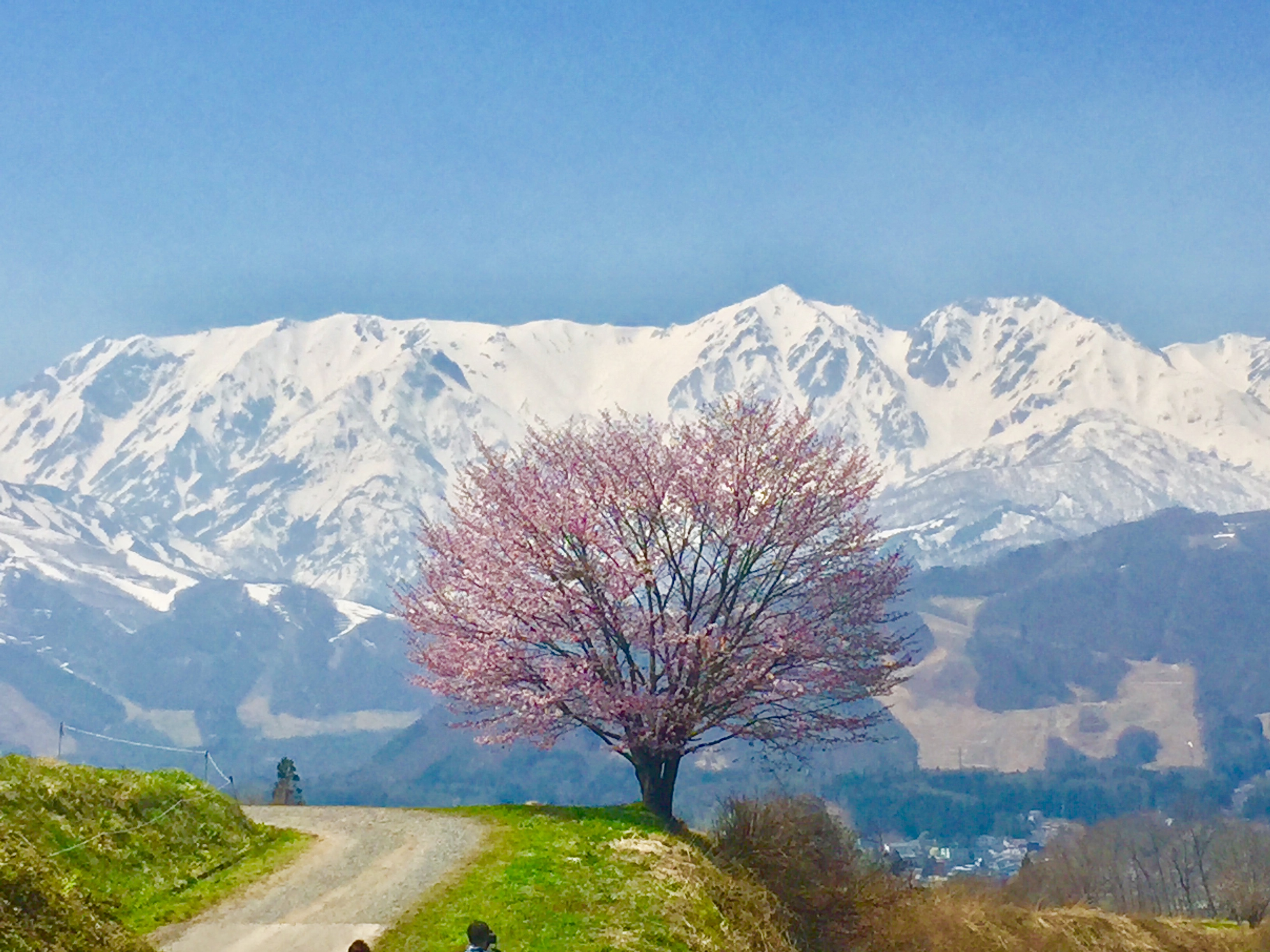 ต้นซากุระโดดเดี่ยวอยู่กลางระหว่างสามภูเขาฮาคุบะ (เครดิตภาพ: JR East / Kobori)