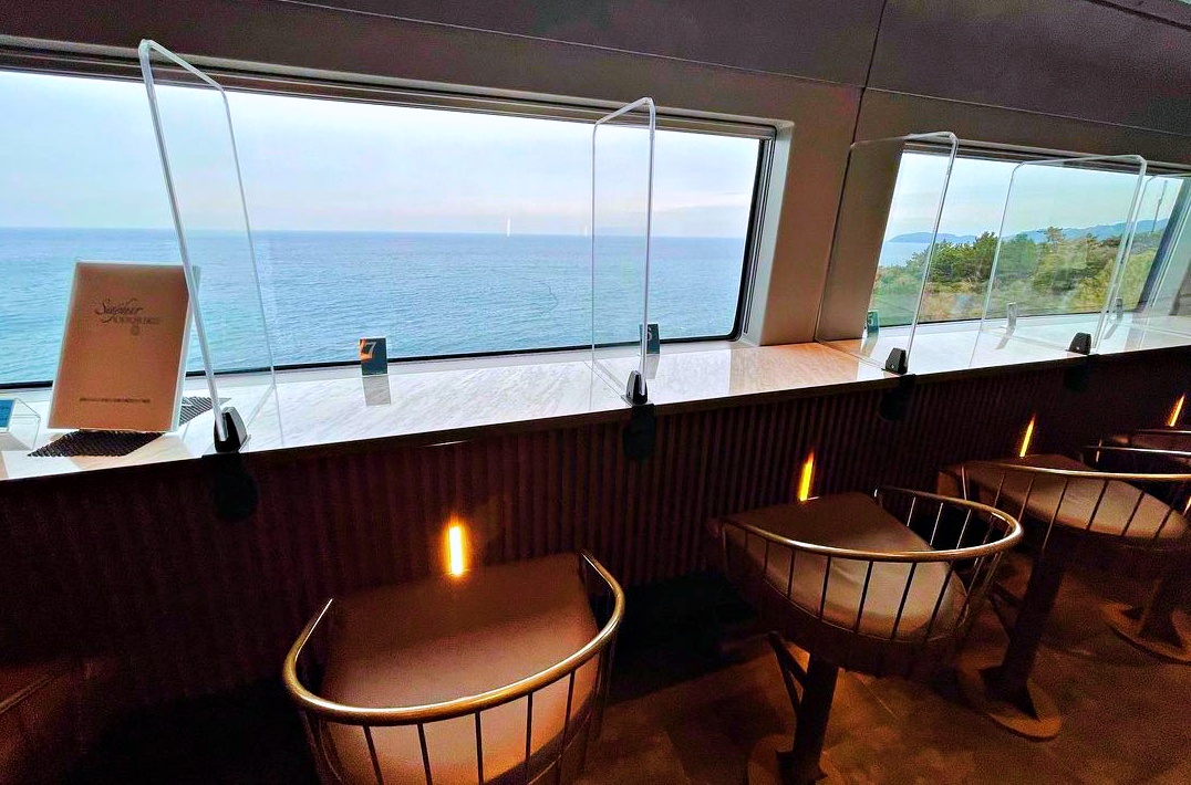 คงไม่มีการชมวิวไหนที่ดีไปกว่าการกินจนท้องอิ่มระหว่างมองออกไปนอกหน้าต่างบานใหญ่อีกแล้ว ระหว่างนั่งมองแสงอบอุ่นที่ส่องผ่านหน้าต่างบานกว้างและวิวผืนทะเลสีไพลินที่ส่องประกายอยู่ คุณสามารถนั่งผ่อนคลายและปล่อยตัวเองให้เพลิดเพลินไปกับการนั่ง SAPHIR ODORIKO ได้เลย! ที่นั่งในห้องอาหารแต่ละที่จะมีการติดตั้งแผ่นกั้นใสไว้เพื่อเป็นหนึ่งในมาตรการป้องกันการแพร่ระบาดของไวรัสโควิด-19 ดังนั้นผู้โดยสารจึงสามารถอร่อยกับมื้ออาหารได้ด้วยความสบายใจ