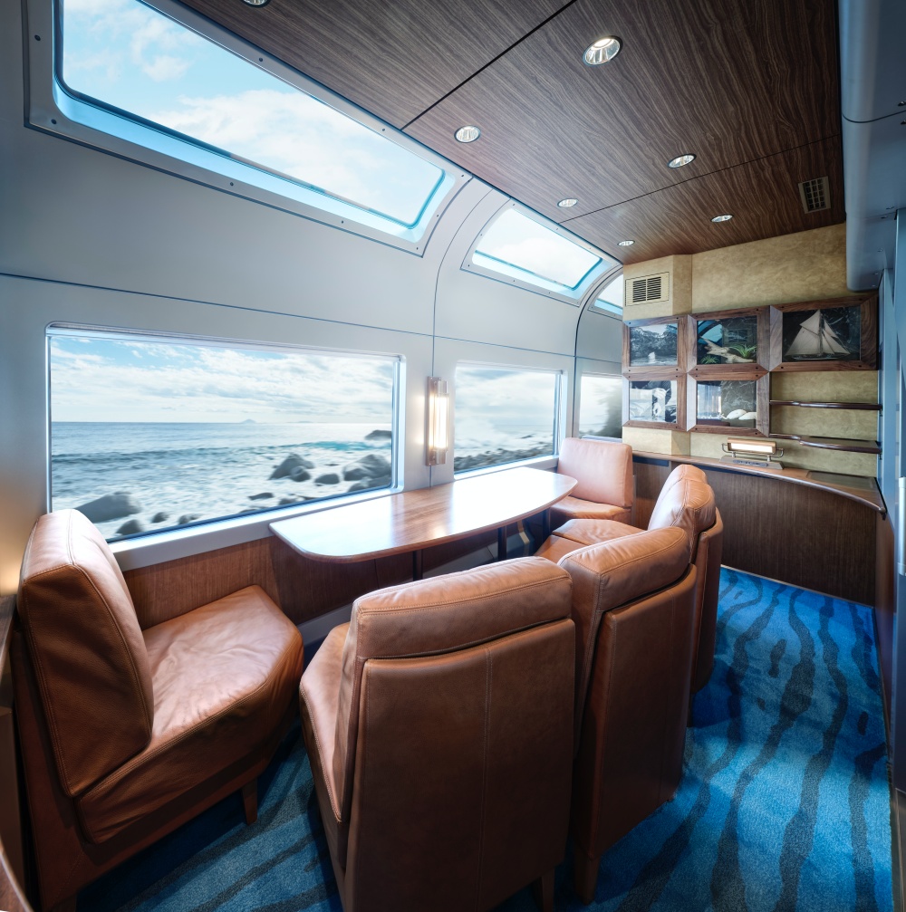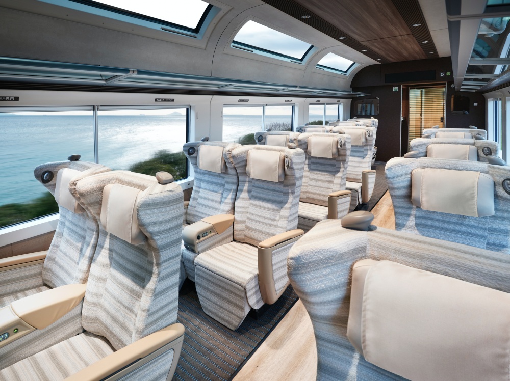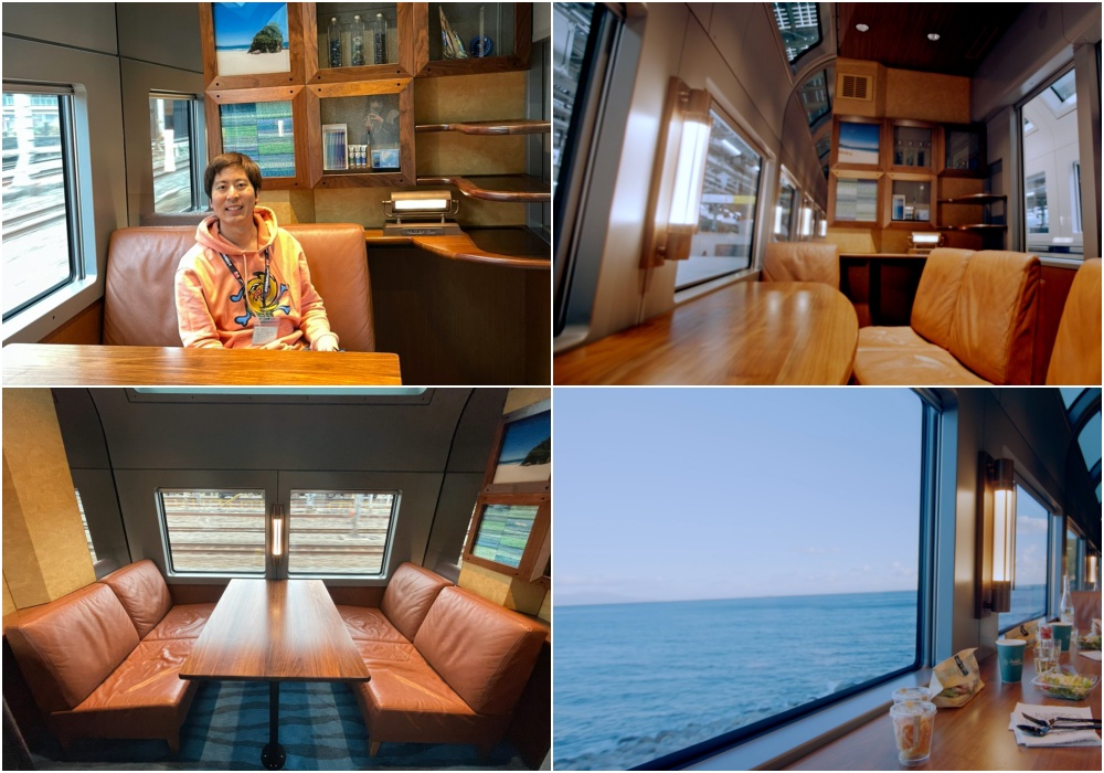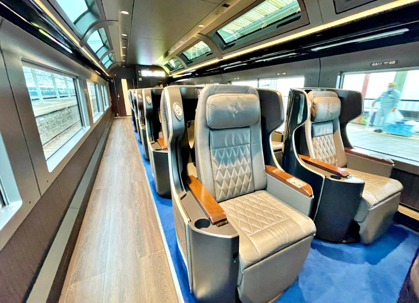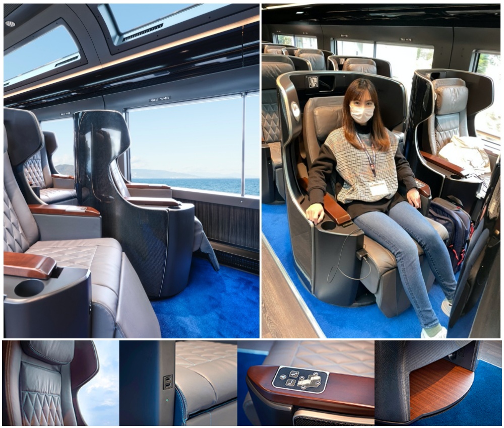ที่นั่งเบาะหนังขนาดใหญ่ที่นุ่มสบายมีความกว้างเป็นพิเศษและให้ความเป็นส่วนตัว อีกทั้งยังอยู่ฝั่งที่จะเห็นวิวทะเลด้วย โดยเบาะนั่งสามารถปรับหันไปทางหน้าต่างเพื่อให้ผู้โดยสารเห็นวิวที่ผ่านไปมานอกหน้าต่างได้ด้วย! นอกจากนี้ หน้าต่างของตู้รถยังมีขนาดกว้างใหญ่และมาพร้อมกับช่องไฟให้เห็นท้องฟ้าข้างบนเพื่อยกระดับประสบการณ์ในการนั่งรถไฟขบวนนี้ด้วย