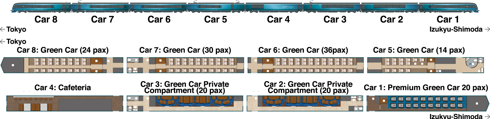 ตู้รถ Premium Green ที่มีที่นั่งสุดพิเศษนั้นจะอยู่ในตู้รถคันที่ 1 ที่จะอยู่ด้านหน้าสุดของขบวนรถไฟในเที่ยวขาไปแหลมอิสุ (และจะอยู่ท้ายขบวนในเที่ยวขาเข้าโตเกียว) ที่นั่งถูกจัดวางแบบ 1+1 ทำให้แต่ละแถวมีที่นั่งเดี่ยวเพียงสองที่นั่งเท่านั้น รวมที่นั่ง Premium Green ทั้งหมดเพียง 20 ที่บนขบวนรถไฟทั้งขบวน