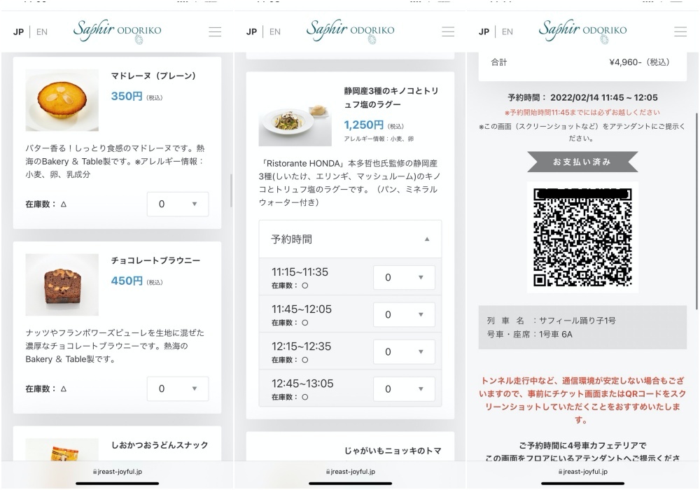 บนเว็บไซต์ ผู้โดยสารสามารถเปิดดูเมนูอาหารและเครื่องดื่มและชำระเงินได้ โดยเมื่อชำระแล้ว ผู้โดยสารจะได้รับ QR Code สำหรับใช้รับอาหารที่สั่ง ณ ตู้รถห้องอาหาร