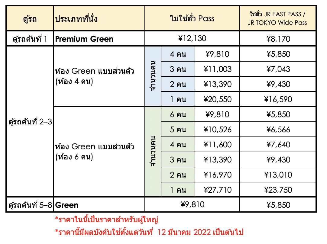 ข่าวดีสำหรับผู้ที่ถือตั๋ว Pass ของ JR East ถ้าคุณใช้ตั๋ว JR EAST PASS หรือ JR TOKYO Wide Pass ล่ะก็ ตั๋วเหล่านี้จะครอบคลุมราคาค่าโดยสารทั่วไปอยู่แล้ว ดังนั้นคุณจึงต้องซื้อเพียงแค่ตั๋วสำหรับส่วนต่างค่าโดยสาร Limited Express และส่วนต่างที่นั่ง Green/Premium Green เท่านั้น ราคาส่วนต่างเหล่านี้จะถูกระบุไว้ในช่องขวาสุดของตารางด้านบน