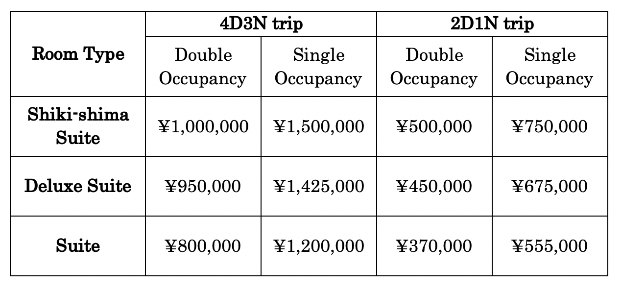 ราคาของการนั่ง Train Suite Shiki-shima นั้นเริ่มตั้งแต่ 370,000 เยนต่อคนสำหรับคอร์ส 2วัน1คืนจน ถึง 800,000 เยนต่อคนสำหรับคอร์ส 4วัน3คืน สำหรับพักสองคนในห้อง Suite เราต้อนรับนักท่องเที่ยวคนเดียวด้วยแต่ราคาจะสูงขึ้นประมาณ 1.5 เท่าของการพักสองคน