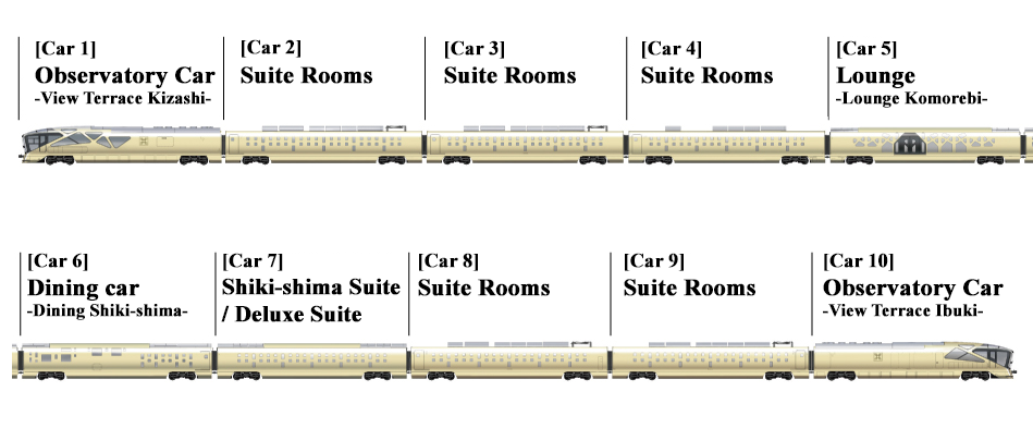 Train Suite Shiki-shima มี 15 ห้อง Suite กระจายไปยังห้าตู้ในแต่ละตู้มี 3 ห้อง ภายในรอบๆแต่ละห้องคุณจะพบกับการตกแต่งและเฟอร์นิเจอร์ที่ทำอย่างพิถีพิถันและเที่ยงตรง และการออกแบบที่ประณีตและหัตถศิลป์ญี่ปุ่นแบบดั้งเดิมที่นำเสนอมาในรูปแบบสมัยใหม่ เช่น ในแต่ละห้องตกแต่งอย่างละเอียดด้วยแผ่นฝาผนังที่ซึ่งใช้น้ำมันเคลือบเงาโจโบจิที่หายากจากจังหวัดอิวาเทะ ตู้ไม้ที่ถูกออกแบบให้เหมือนกับหีบโบราณของเมืองเซนได