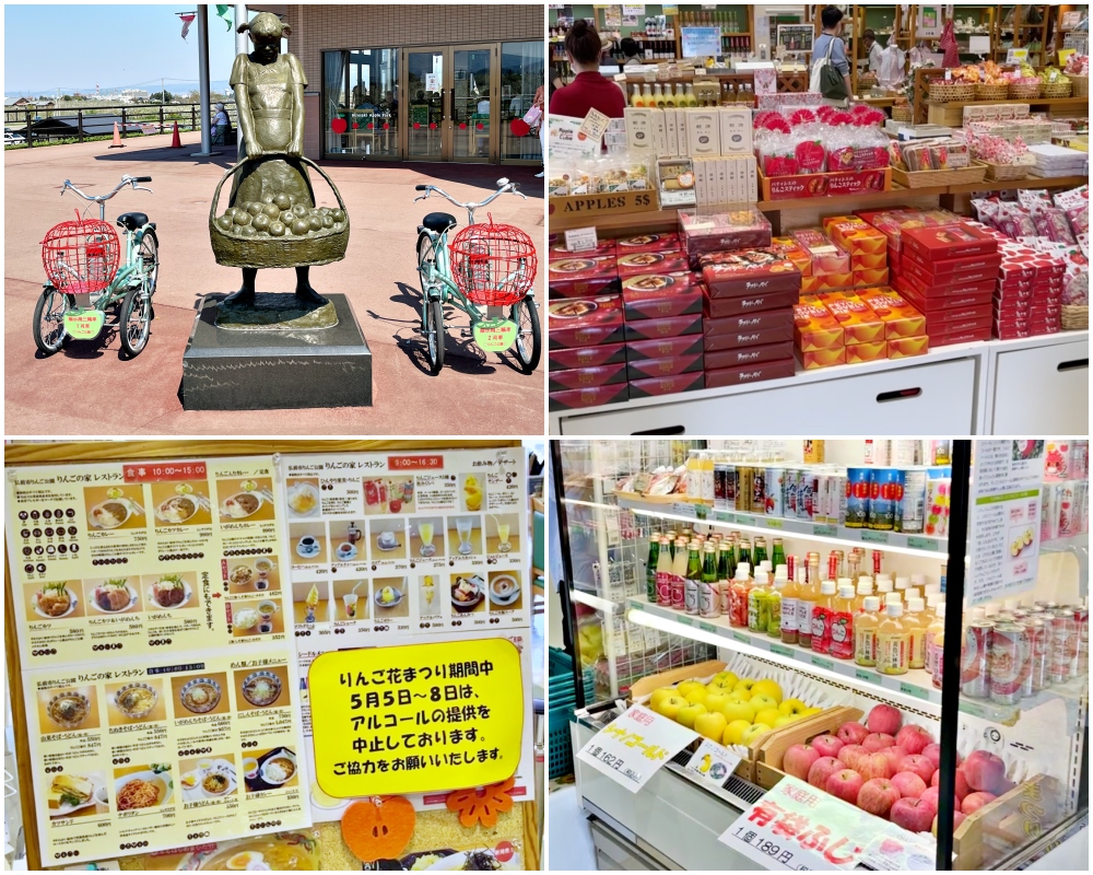 หลังจากที่เดินเล่นไปรอบๆสวนแอปเปิ้ลอันกว้างขวางแล้วมาพักผ่อนที่ร้านขายของฝากที่ซึ่งคุณสามารถซื้อผลิตภัณฑ์อันหลากหลายมากเกี่ยวกับแอปเปิ้ล และยังมีคาเฟ่เล็กๆภายในด้วยชื่อว่า รินโกะโนะอิเอะ (Ringo no Ie りんごの家) ที่ซึ่งคุณสามารถทานอาหารว่างหรือของหวาน อาหารบางอย่างมีเอกลักษณ์ประกอบไปด้วยอาหารที่ใส่แอปเปิ้ลอย่างเช่น ข้าวแกงกะหรี่ญี่ปุ่นแอปเปิ้ล ราเมนแอปเปิ้ลหรือเนื้อชุบแป้งทอดใส่แอปเปิ้ล และของหวานอย่างเช่น พาเฟ่ห์แอปเปิ้ล แอปเปิ้ลปั่น ครีมพัฟแอปเปิ้ลและประเภทน้ำแอปเปิ้ล ถ้าคุณรักแอปเปิ้ลละก็ลองเช็คดูสิ
