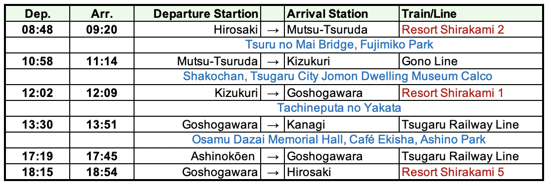 - 9:46–10:03 สถานี Hirosaki → สวนแอปเปิ้ลฮิโรซาคิ (รถบัส)