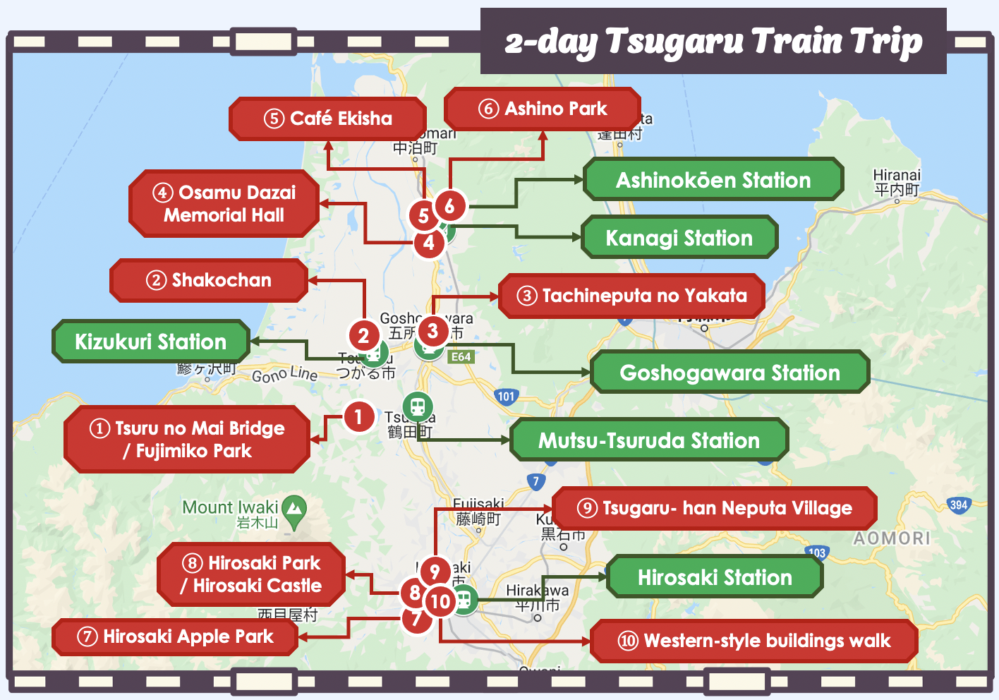 ตารางเวลารถไฟในบทความนี้ถูกต้อง ณ เดือนพฤษภาคม 2022 แต่อาจจะมีการเปลี่ยนแปลงด้วยการตัดสินใจของบริษัทรถไฟ เช็คตรวจสอบอยู่เสมอสำหรับตารางเวลารถไฟล่าสุดก่อนที่จะเริ่มการเดินทางของคุณ รถไฟสาย Tsugaru Railway Line ไม่ครอบคลุมด้วยตั๋วพาส JR EAST PASS (Tohoku area).