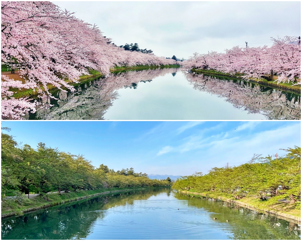 ต้นซากุระตลอดคูปราสาทฮิโรซาคิทางด้านตะวันตกขณะที่ดอกซากุระบาน (บน) และหลังจากที่ดอกไม้บานและร่วงหมด (ล่าง) (เครดิตภาพ: JR East / Carissa Loh และ JR East / Kobori)