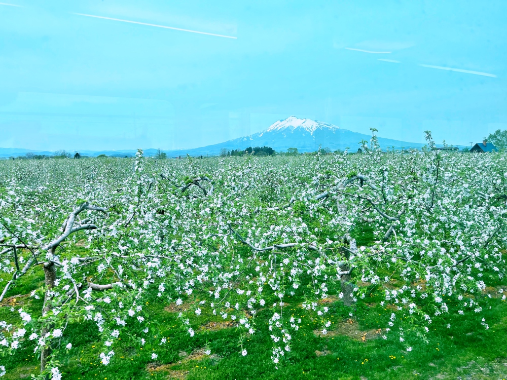 ต้นแอปเปิ้ลออกดอกและภูเขาอิวาคิเป็นพื้นหลัง (เครดิตภาพ: JR East / Kobori)