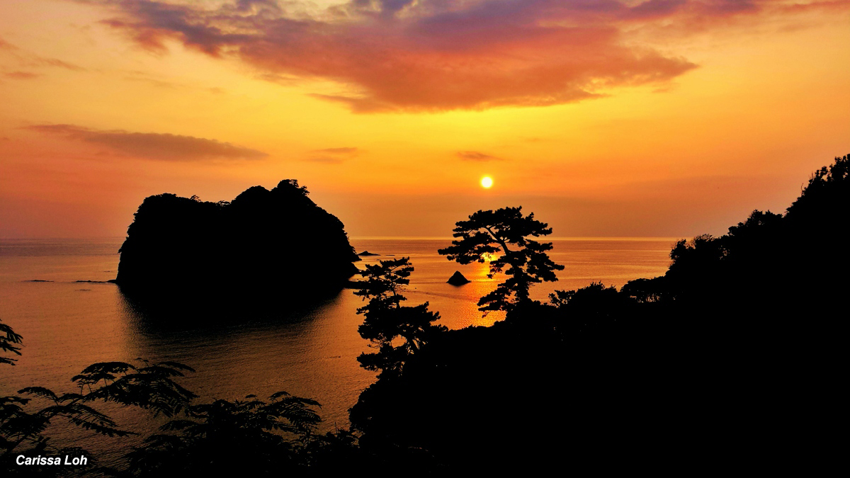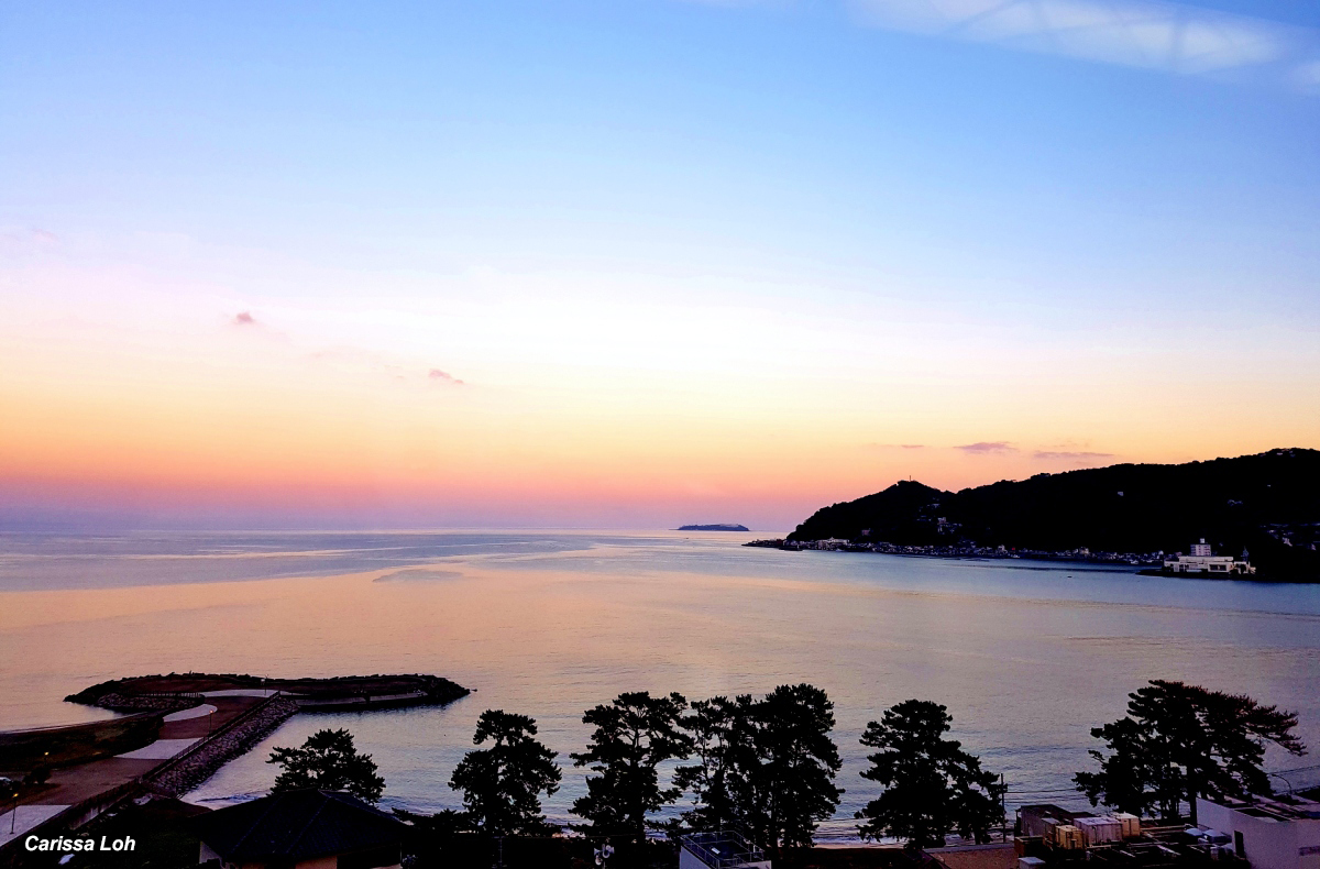 วิวสีทองของพระอาทิตย์ตกที่เกาะโดกะชิม่าบนชายฝั่งตะวันตกของคาบสมุทรอิซุ (เครดิตภาพ: JR East / Carissa Loh)