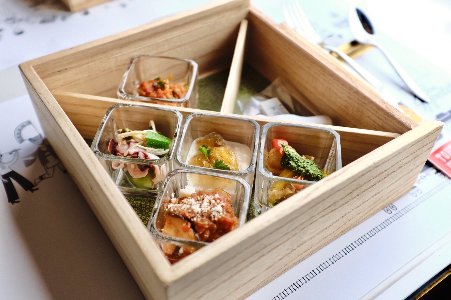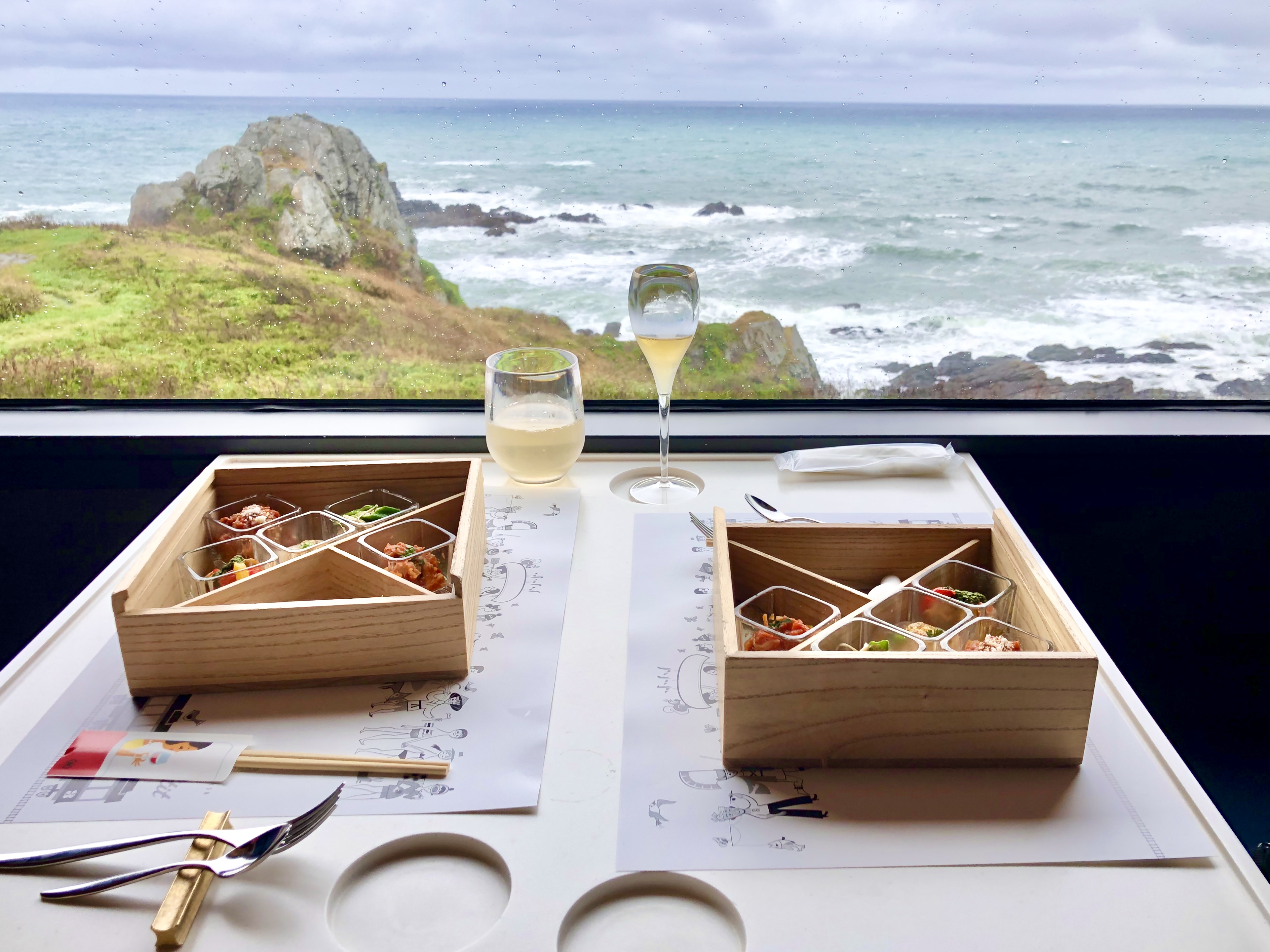 Trong chuyến đi lần này, các món ăn do đầu bếp Harata Ken của nhà hàng món Ý Trattoria Lipagio ở Aomori phụ trách. Đầu tiên là khai vị với 6 món ăn từ hải sản và rau có hương vị nhẹ nhàng được đặt trong các chén thủy tinh nhỏ, tất cả được xếp vào một hộp gỗ xinh xắn nhưng vẫn giữ được sự sang trọng. Ấn tượng nhất với mình phải kể đến món nhum biển ăn kèm sốt kem bông cải trắng!