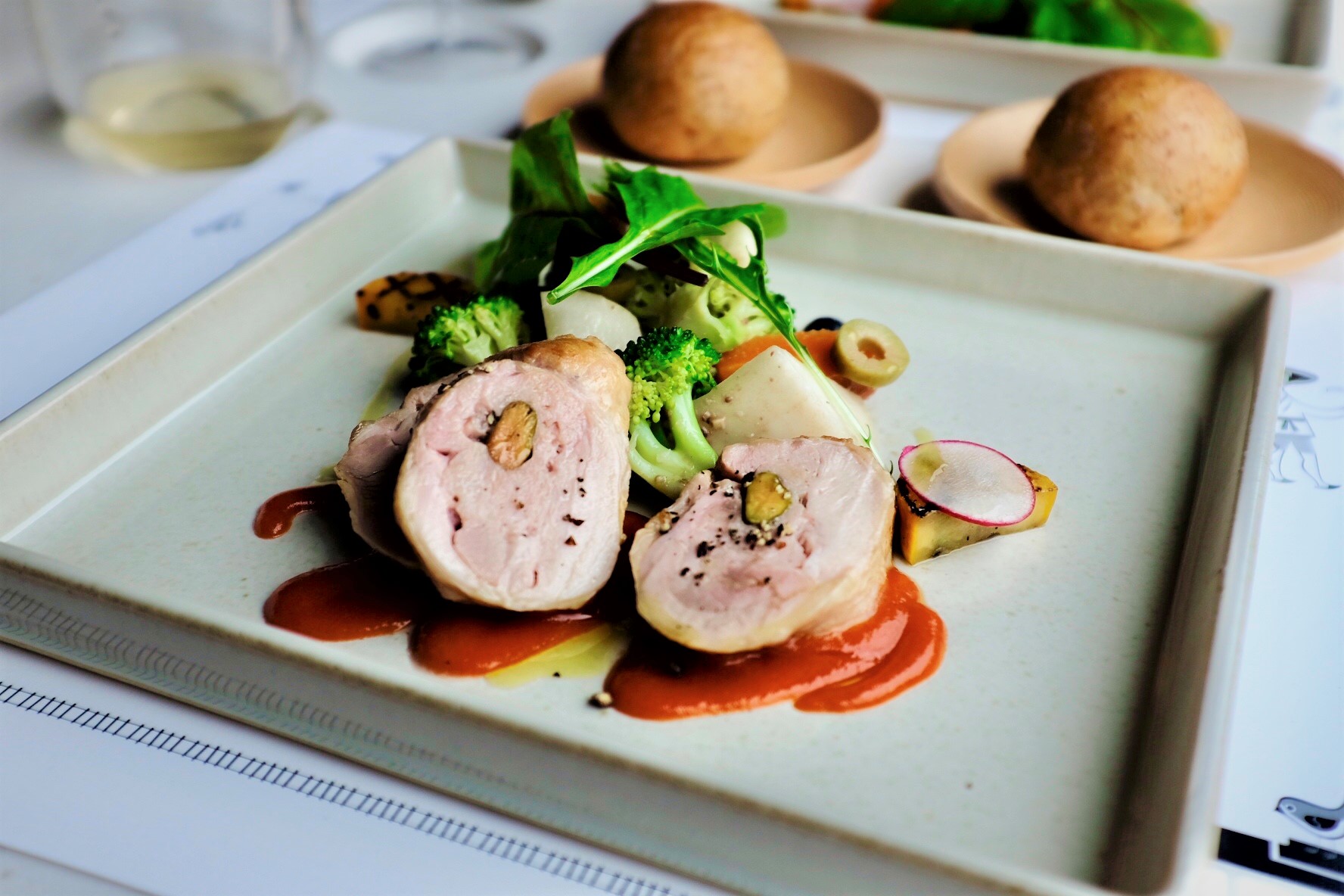Sau món Pasta với sốt mực ngon hết ý, tụi mình được thưởng thức món chính làm từ thịt gà, măng tây và các loại rau củ địa phương ăn kèm sốt cà chua tươi. Món ăn được trình bày cực kỳ tinh tế như trong nhà hàng cao cấp, khiến mình vừa muốn thưởng thức, nhưng lại không nỡ phá hỏng một tác phẩm nghệ thuật đẹp đến vậy.