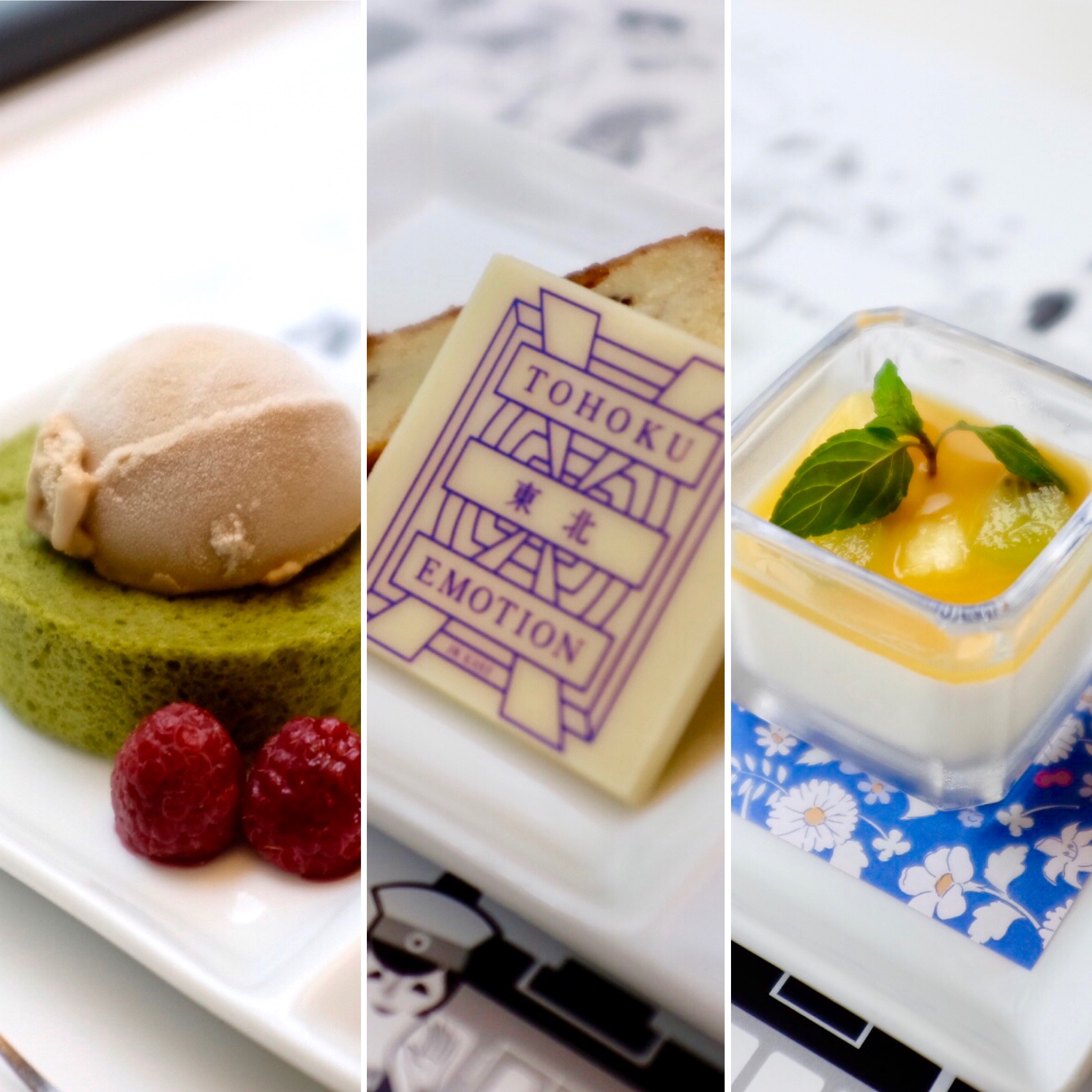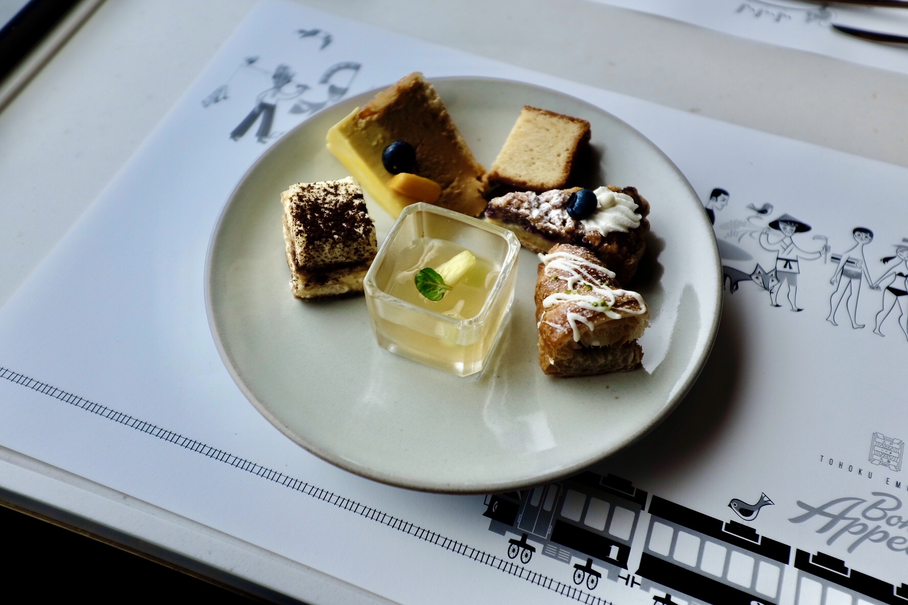 Trước tiên, bạn sẽ được phục vụ set tráng miệng tiêu chuẩn, bao gồm món socola trắng có in logo chuyến tàu TOHOKU EMOTION, dùng chung với kem, bánh bông lan và thạch xoài. Tiếp đến, bạn có thể sang toa có quầy bếp để thưởng thức buffet với đủ loại bánh ngọt, bánh tart và thạch trái cây. Ngoài ra, còn có nhiều loại đồ uống, chủ yếu là trà, cà phê và nước trái cây không cồn mà bạn có thể thử cùng với các món tráng miệng.