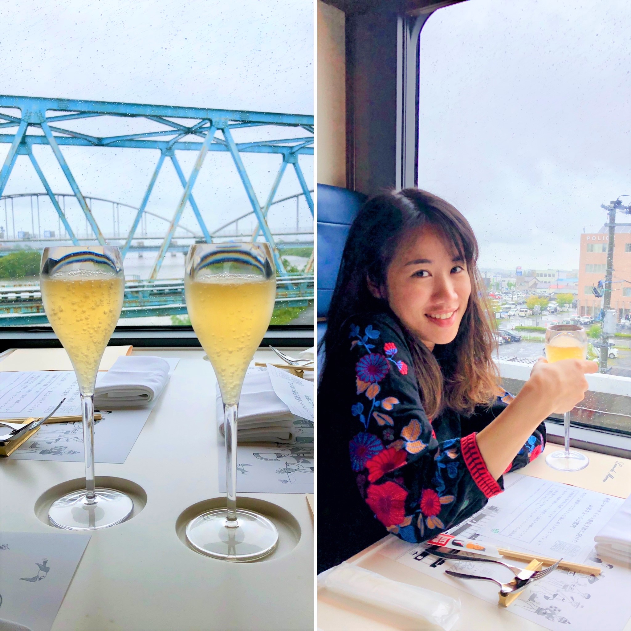 Ngay khi vừa ổn định chỗ ngồi, nhân viên sẽ phục vụ một loại đồ uống chào mừng bạn lên tàu, có thể là một loại rượu sparkling nhẹ hoặc soda với nước ép làm từ táo của vùng Aomori.