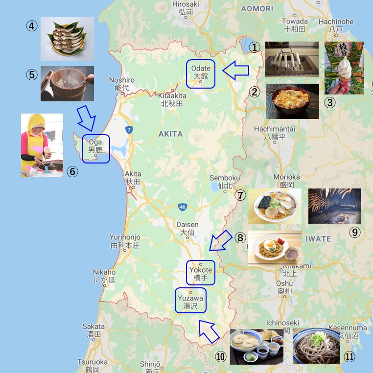 Bản đồ ẩm thực Akita có thể chia thành ba khu vực: Phía Bắc Akita (Ōdate City), bán đảo Oga, và phía Nam Akita (Yokote và Yuzawa). (Nguồn ảnh: Akita Prefecture / Google Maps)