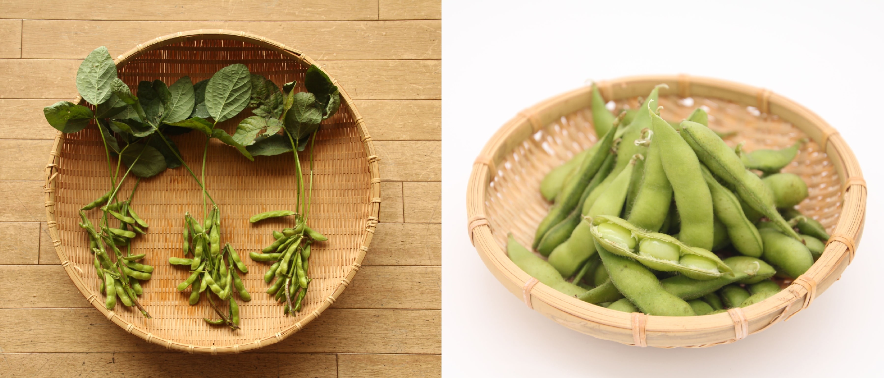 Khí hậu của Ōdate lý tưởng để trồng đậu edamame, hình dưới đây là các nhánh đậu vừa được thu hoạch (trái) và quả đậu (phải) như thường được bày bán. (Nguồn ảnh: Akita Inu Tourism)